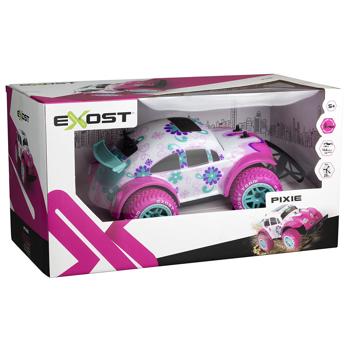 Exost - Voiture Télécommandée Pixie - Cette voiture télécommandée au look girly possède une magnifique coque amovible rose et fleurie. La Pixie est une véritable voiture tout-terrain : elle possède des pneus qui lui permettent d'encaisser tous les chocs ! Elle est capable d'atteindre une vitesse de pointe de 12km/h. Très facile à prendre en main, elle idéale pour les enfants dès 5 ans.