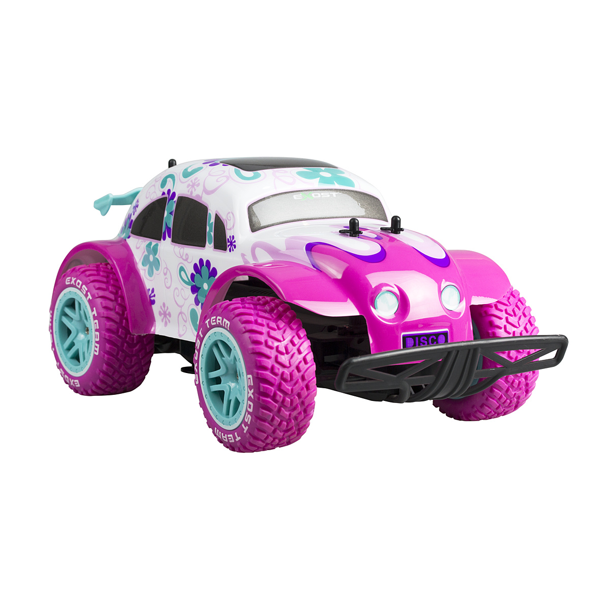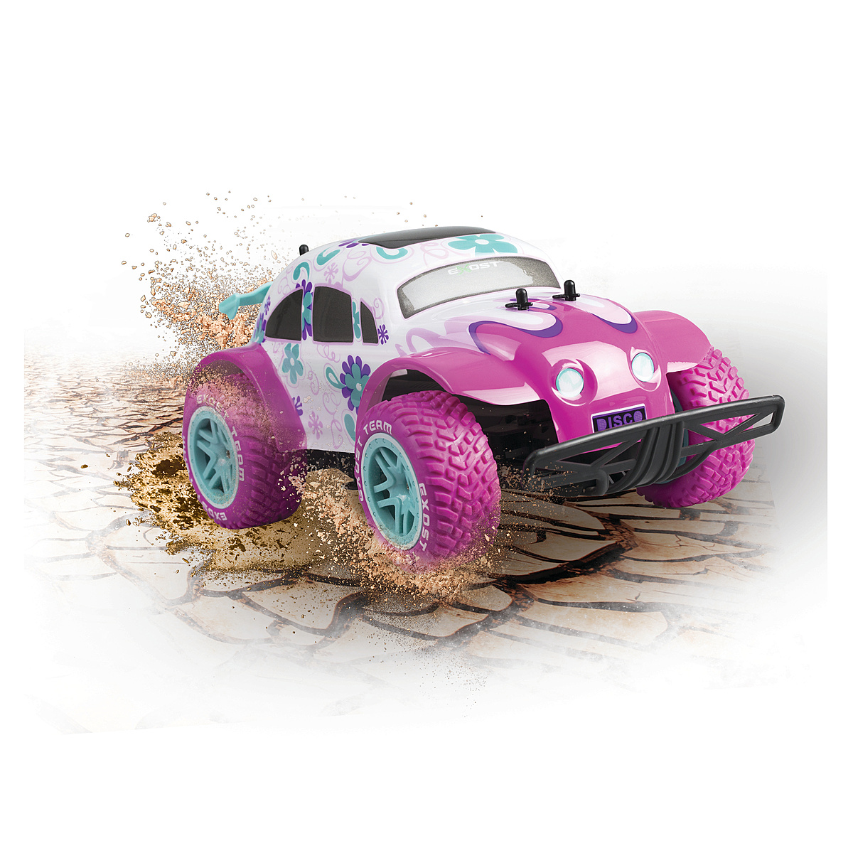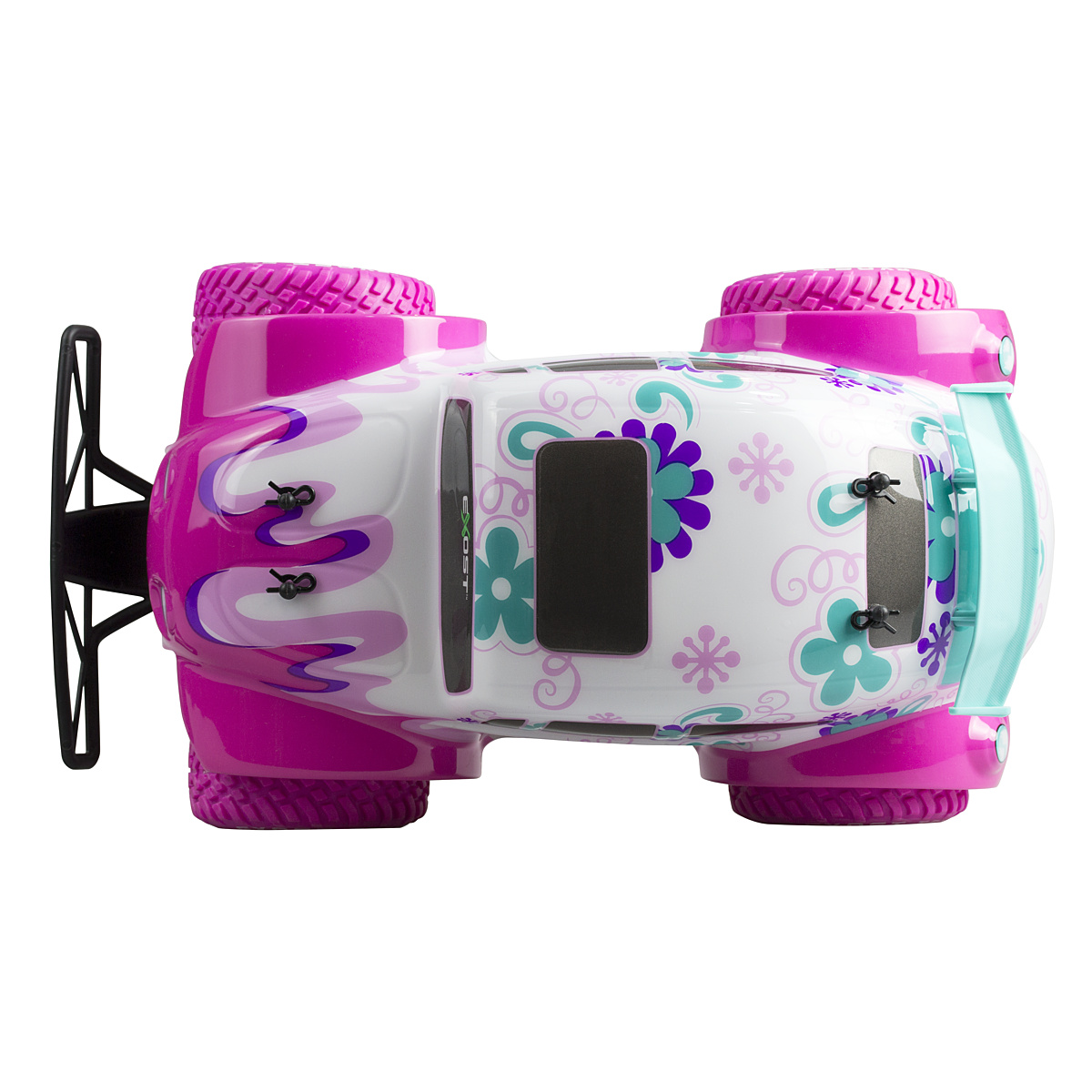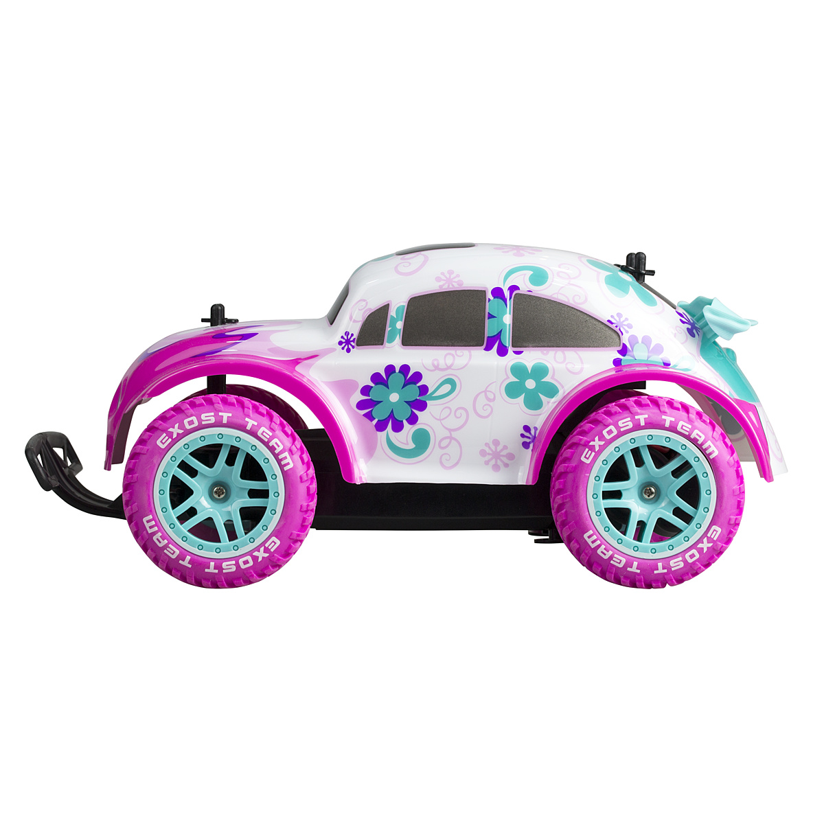 Exost - Voiture Télécommandée Pixie - Cette voiture télécommandée au look girly possède une magnifique coque amovible rose et fleurie. La Pixie est une véritable voiture tout-terrain : elle possède des pneus qui lui permettent d'encaisser tous les chocs ! Elle est capable d'atteindre une vitesse de pointe de 12km/h. Très facile à prendre en main, elle idéale pour les enfants dès 5 ans.