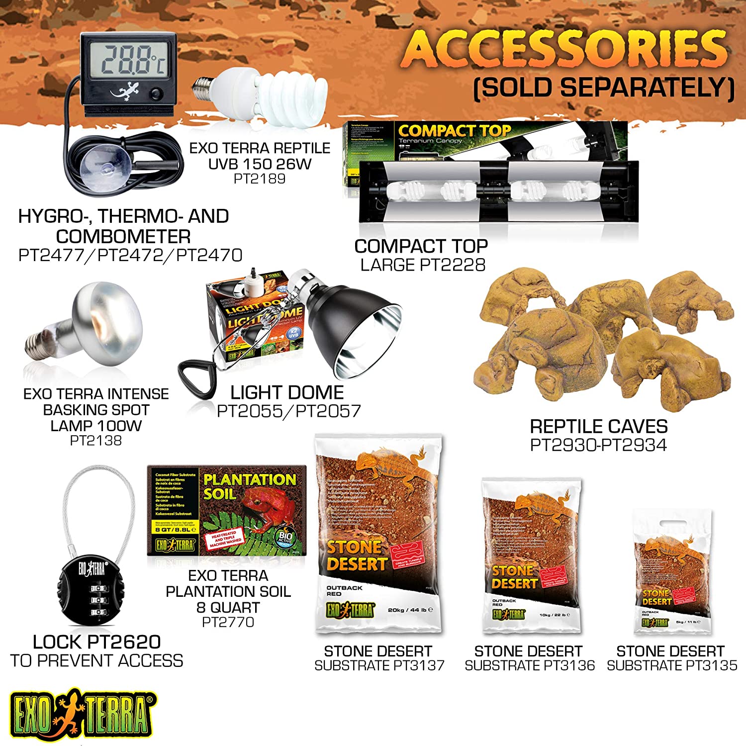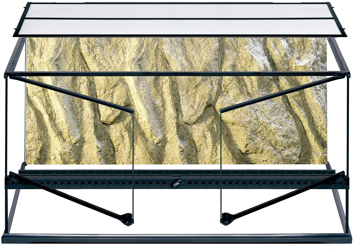 Sa partie fixe très élevée du devant est idéale pour les reptiles qui creusent et s?enfouissent, car on peut y mettre une bonne couche de substrat, ou un petit plan d?eau s?il s?agit d?un paludarium, ou encore y installer un abri Exo Terra pour reptiles. La couleur de son arrière-plan d?aspect naturel s?harmonise aux autres accessoires décoratifs Exo Terra (bols à eau, cascades, pierres chauffantes Heat Wave, etc.) et cet arrière-plan constitue un endroit supplémentaire où un reptile peut grimper.
