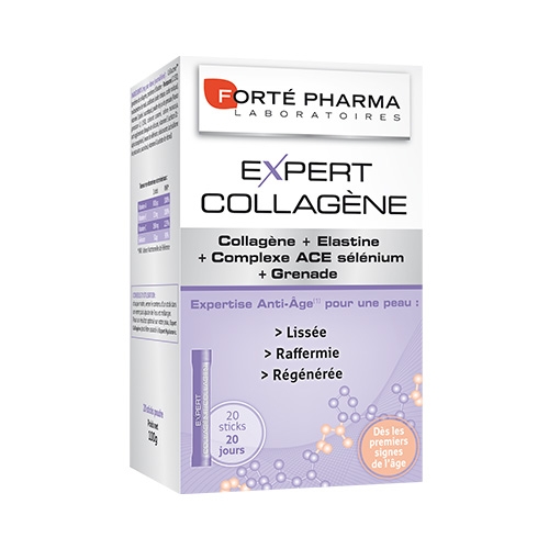 Simple à utiliser, un seul stick par jour d’Expert Collagène vous apporte 2000 mg de collagène d'origine marine. De plus, pour une action renforcée, sa formule associe de la grenade, de la vitamine A et un complexe vitamines C, E et sélénium qui contribue à protéger les cellules contre le stress oxydatif. Le collagène : cette molécule aux propriétés exceptionnelles est naturellement présente au niveau de la peau. Elle en est d’ailleurs le principal constituant et assure sa tenue et son élasticité. Passé 45 ans le renouvellement du collagène diminue de manière significative et celui-ci se retrouve donc en concentration moins importante au niveau du derme. Ce phénomène, qui s’intensifie avec l’âge, occasionne un amincissement de la peau et des cassures cutanées : les rides. La vitamine A contribue au maintien d'une peau normale. La vitamine C contribue à la formation normale de collagène pour assurer la fonction normale de la peau. Complément alimentaire Laboratoires Forté Pharma SAM, 41 avenue Hector Otto, le Patio Palace, 98 000 MONACO