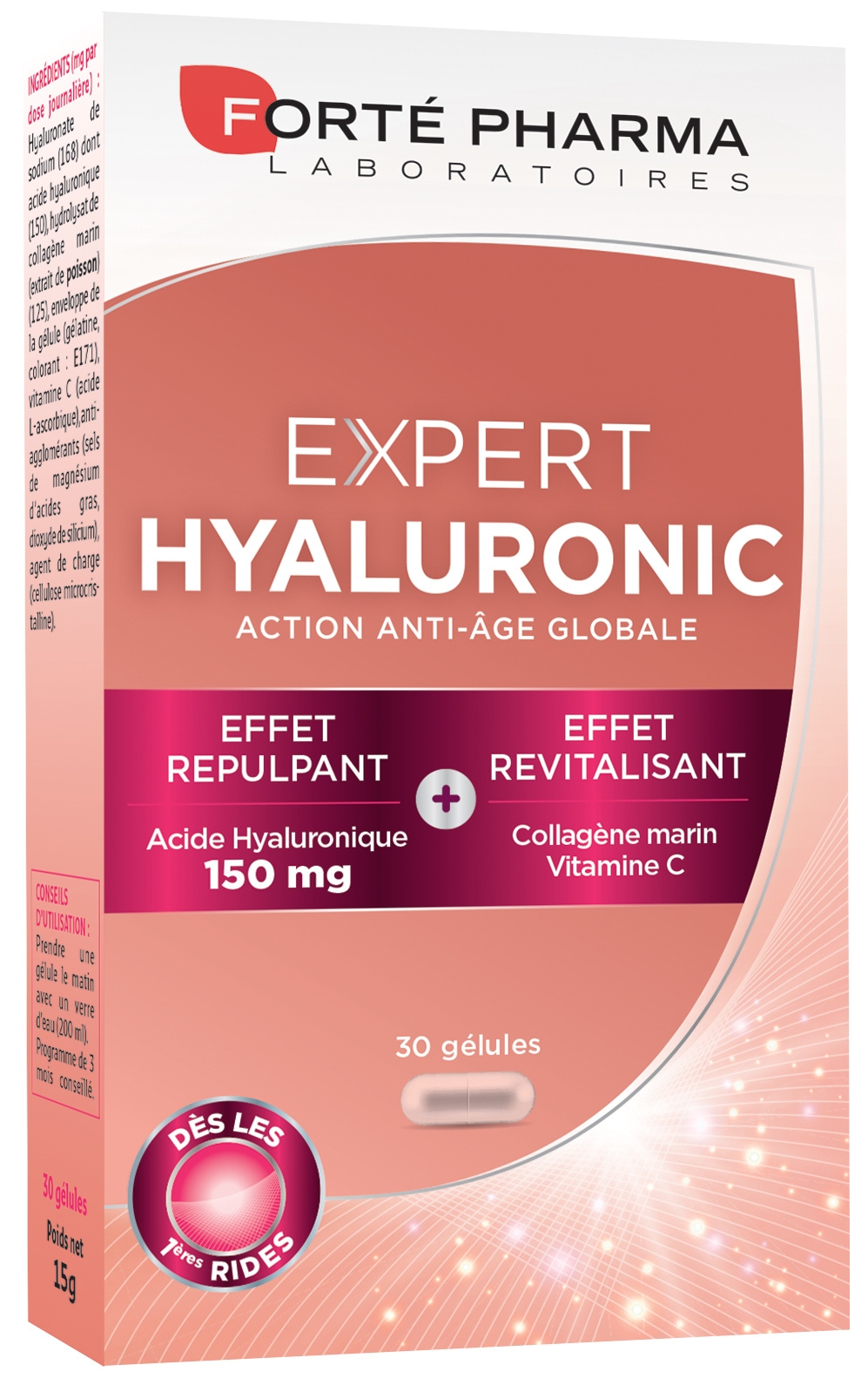 Propriétés : EXPERT HYALURONIC est une formule originale qui associe l’acide hyaluronique, le collagène marin et la vitamine C pour un résultat optimal. La formule d’EXPERT HYALURONIC repose sur une association de deux constituants naturels de la peau : 150 mg d’acide hyaluronique capable de fixer jusqu’à 1000 fois son poids en eau et 100 mg de collagène marin. En complément, la vitamine C contribue à la formation normale de collagène pour assurer la fonction normale de la peau et contribue à protéger les cellules contre le stress oxydatif Complément alimentaire Laboratoires Forté Pharma SAM, 41 avenue Hector Otto, le Patio Palace, 98 000 MONACO