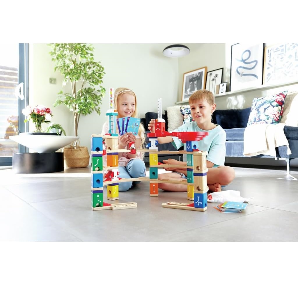 Découvrez le circuit à billes en bois Expert Quadrilla Challenge. Ce circuit à billes est composé de 159 pièces de formes et de couleurs différentes, livré avec 40 billes.
