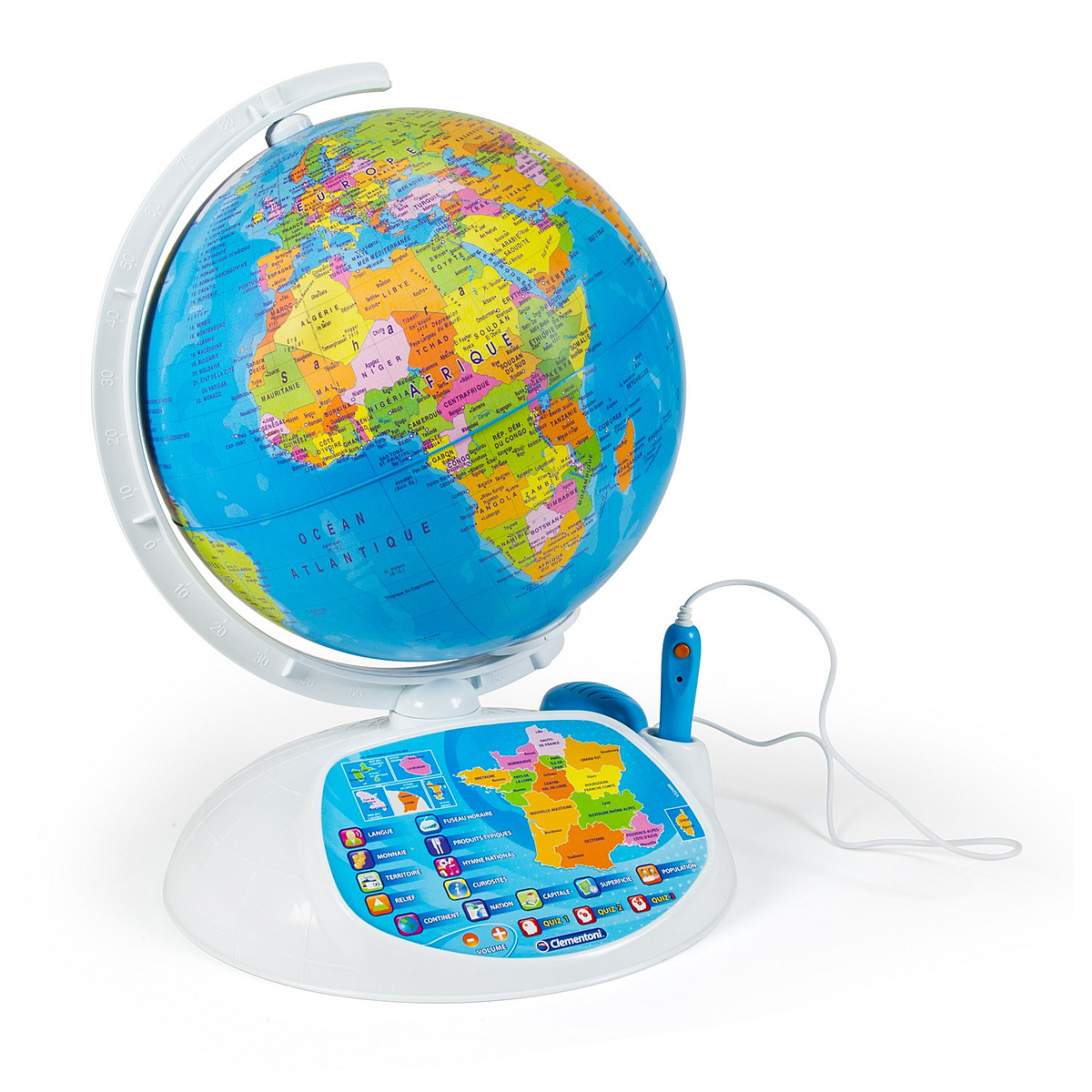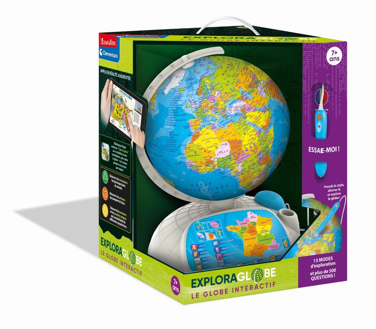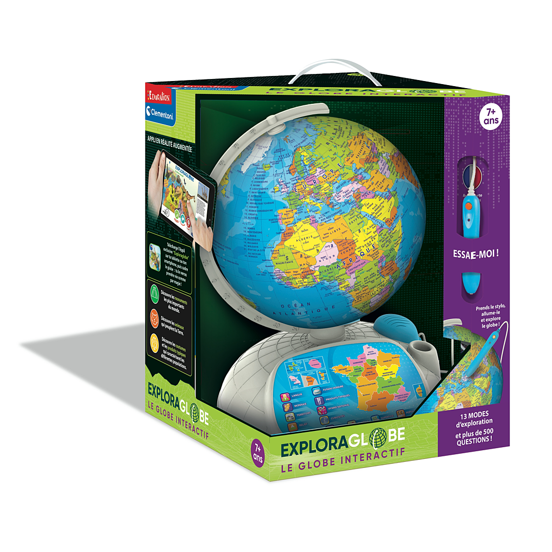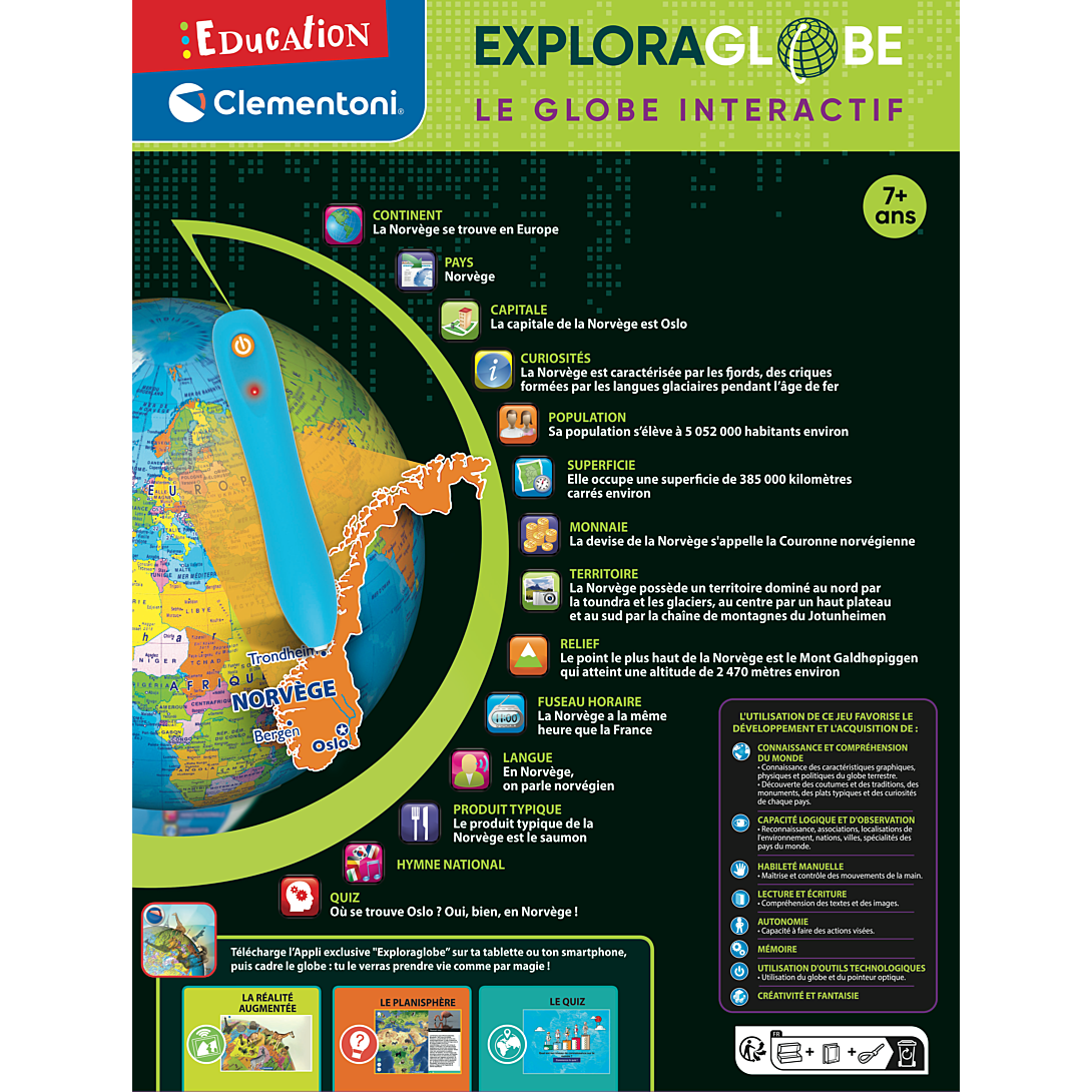 • Un globe interactif et son stylo à lecture optique pour découvrir le monde de façon interactive ! • Thèmes abordés : Continents, Pays, Capitales, Superficies, Populations, Monnaies, Langages, Territoires, Altitudes, Fuseaux horaires, Curiosités, Produits typiques, Hymnes. • Avec plus de 500 questions divisées en 3 niveaux de difficulté pour tester ses connaissances. • Avec l'appli à télécharger gratuitement, les enfants pourront vivre une incroyable expérience de réalité augmentée : cadrez le globe avec un smartphone ou une tablette et des animaux, des monuments ou d'autres éléments apparaîtront sur le globe !