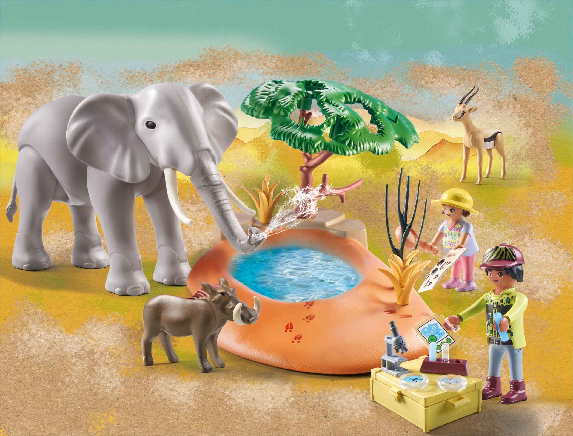 Plus produit Wiltopia avec plus de 80% de matériaux recyclés ou biosourcés en moyenne\nTrois animaux de la savane\nDeux explorateurs avec leur matériel\nUn éléphant avec oreilles et trompe mobiles\nSet avec animaux de la savane