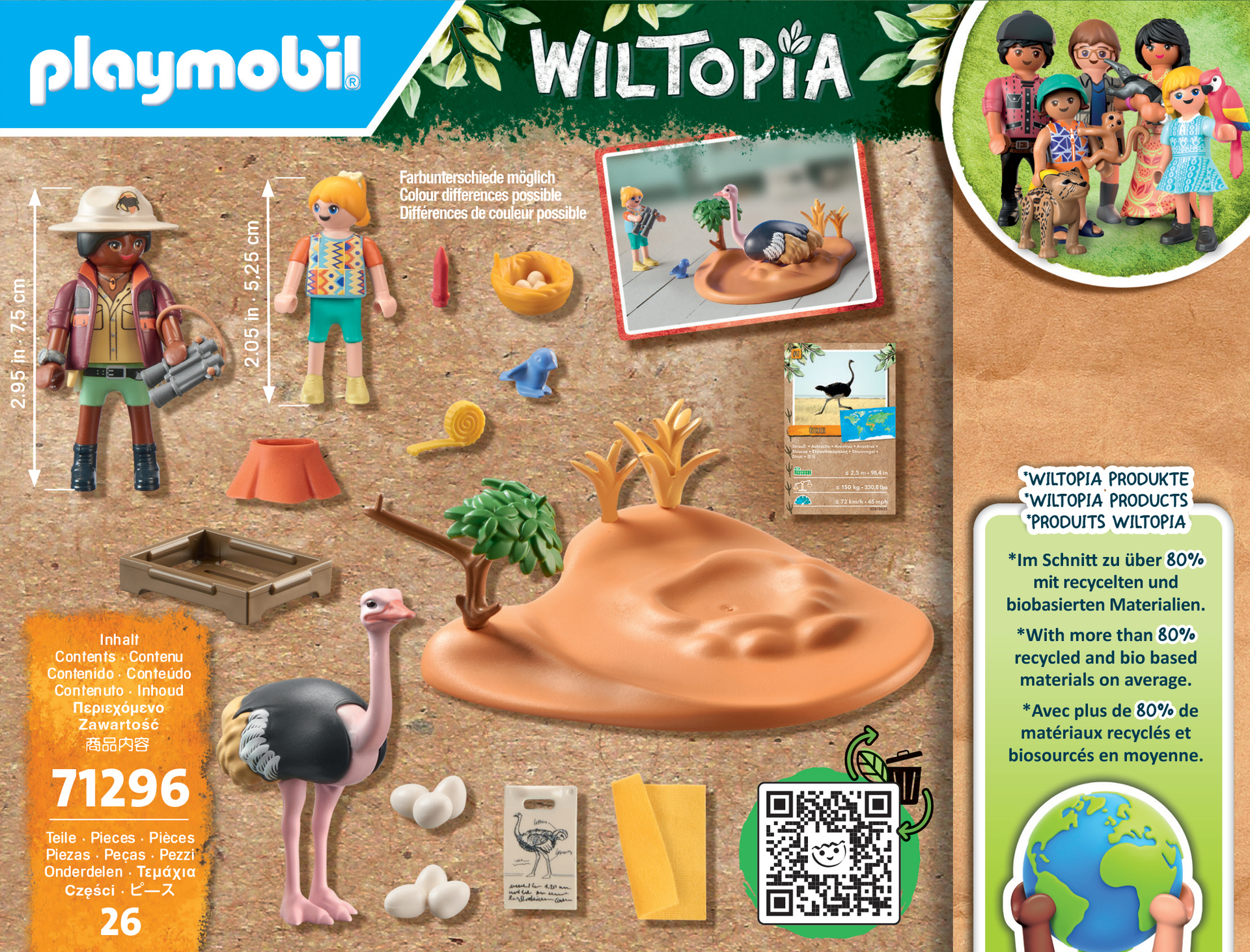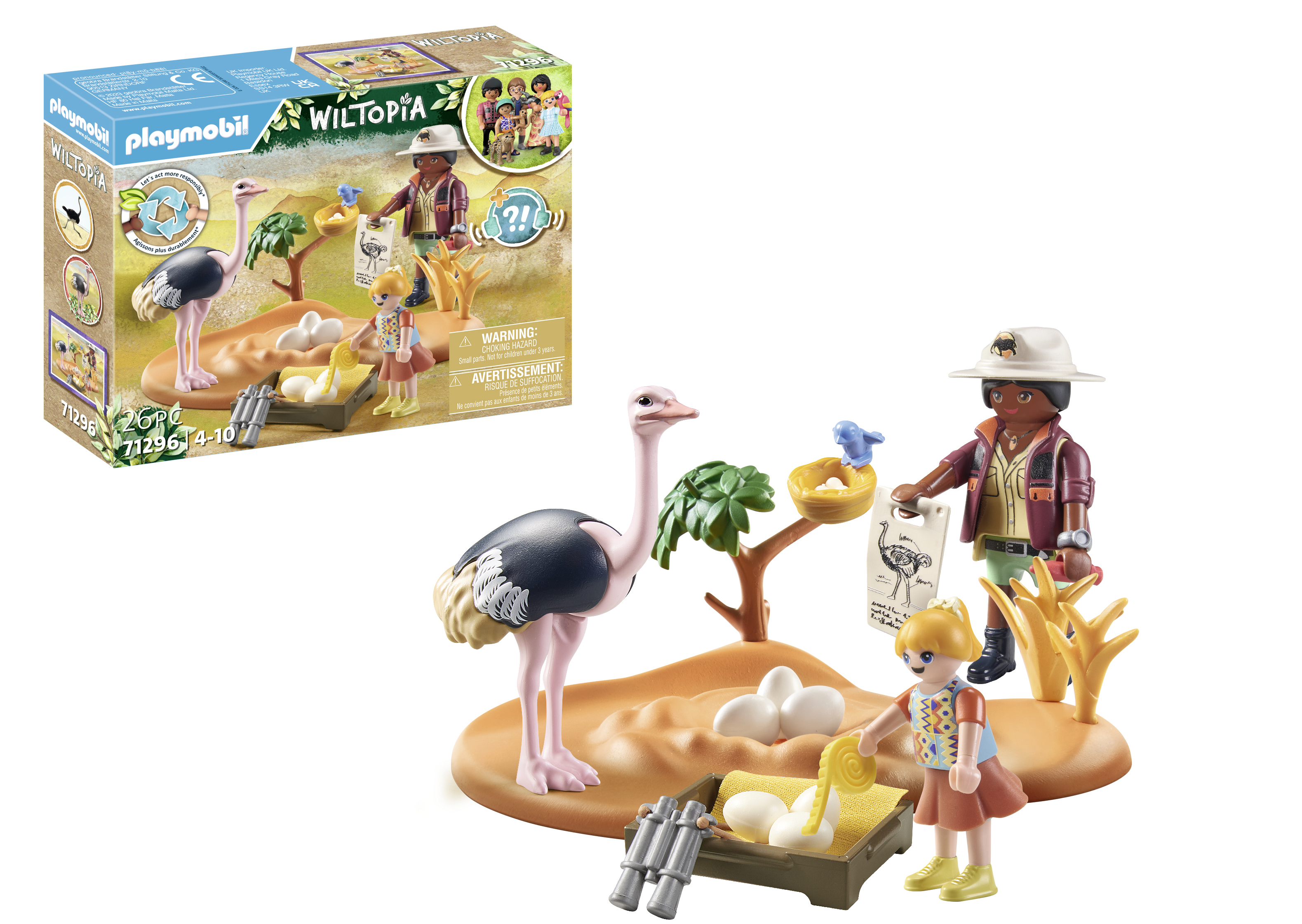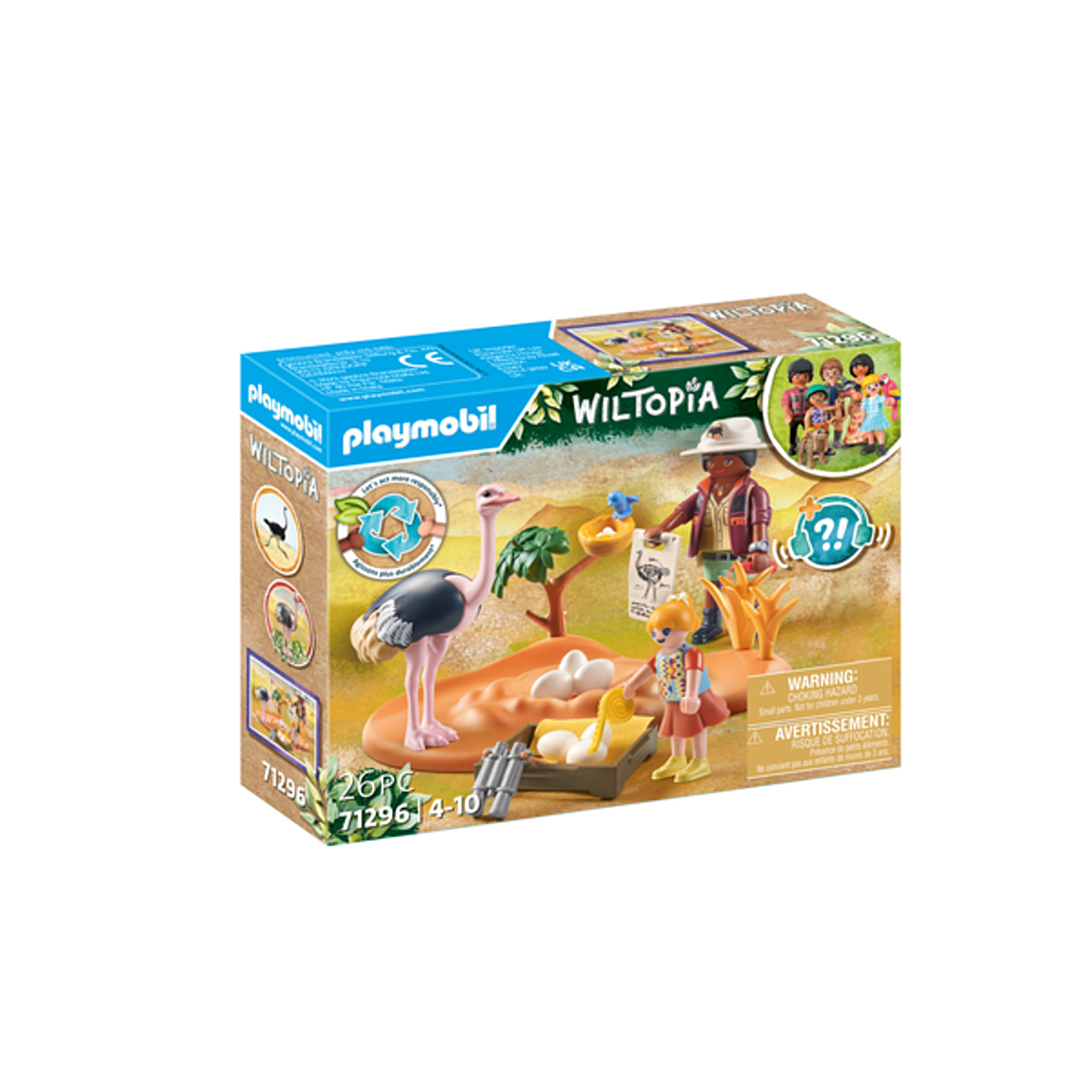 Plus produit Wiltopia avec plus de 80% de matériaux recyclés ou biosourcés en moyenne.\nLes pattes de l\'autruche peuvent être retirées pour lui permettre de couver ses ufs \nLes ufs peuvent être placés et retirés du nid\nDeux explorateurs