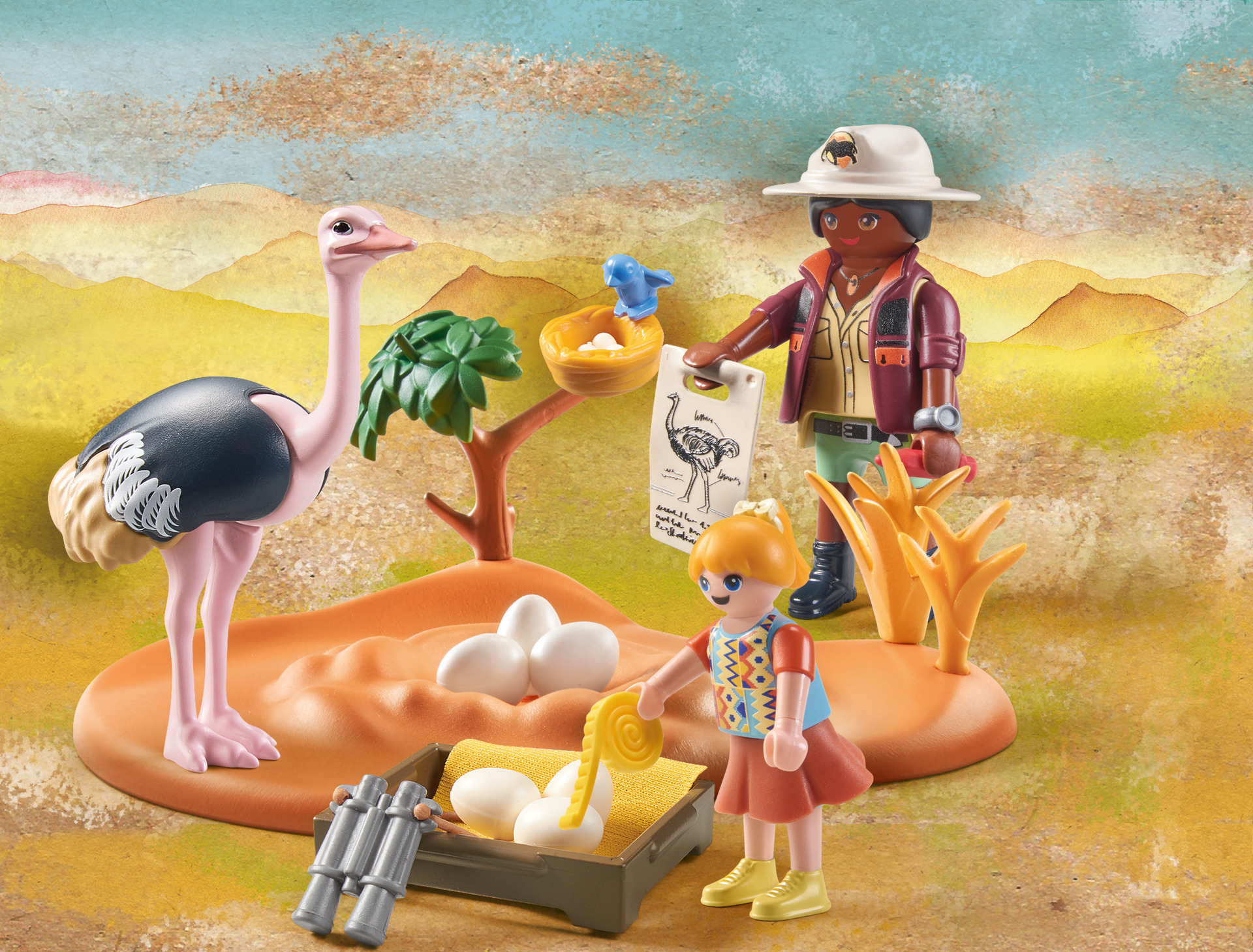 Contient deux personnages, une autruche ainsi que des œufs et des accessoires