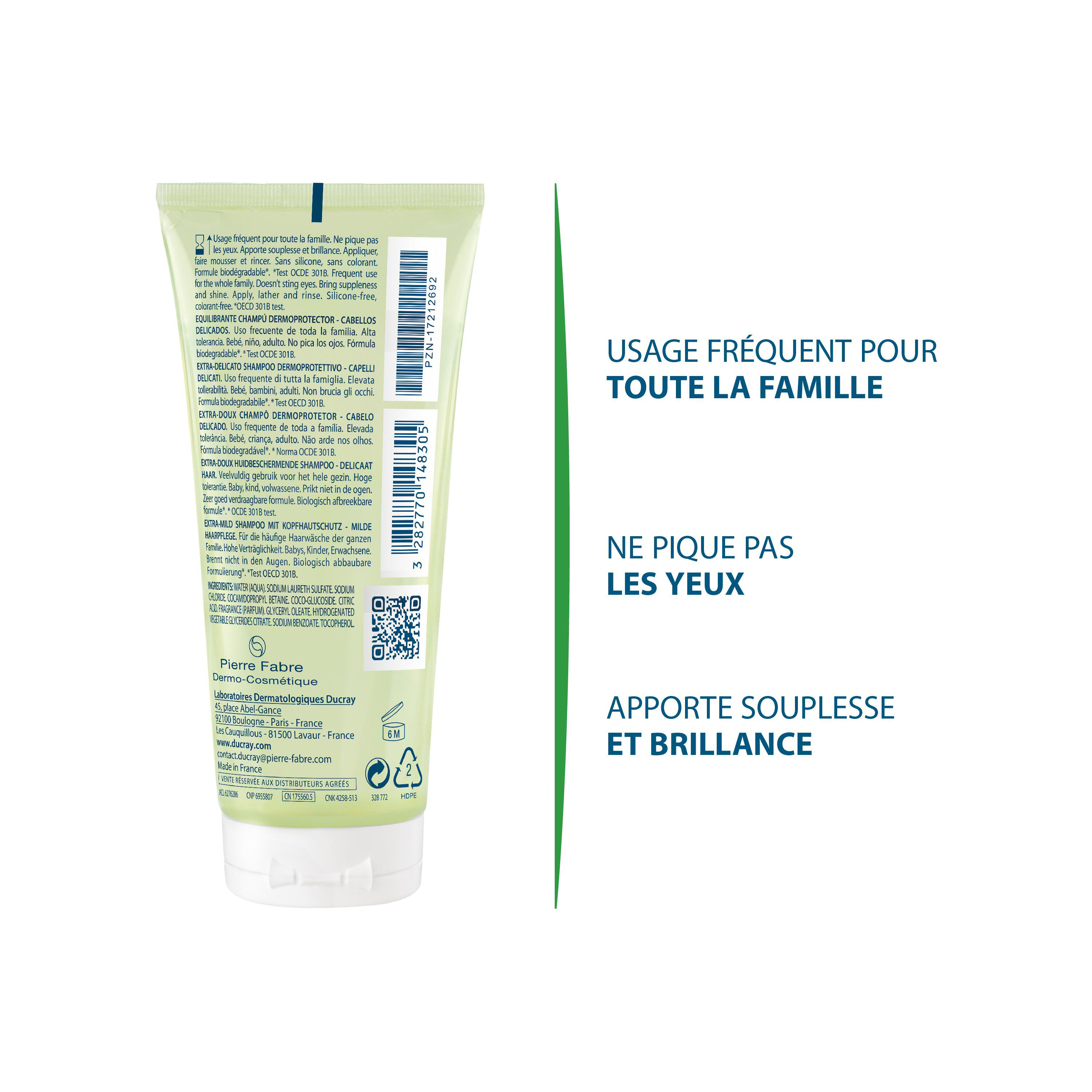 Le Shampooing Dermo-protecteur Extra-Doux est un soin d’hygiène quotidien à destination des cheveux normaux et délicats. Sa formule aux tensioactifs doux permet un nettoyage tout en douceur des cheveux de toute la famille et respecte le cuir chevelu. Hydratés et protégés, les cheveux retrouvent beauté et brillance. Une formule biodégradable**, naturelle, haute tolérance et adaptée pour un usage fréquent dès 2 ans. **Formule biodégradable. Selon la norme internationale OCDE 301B.