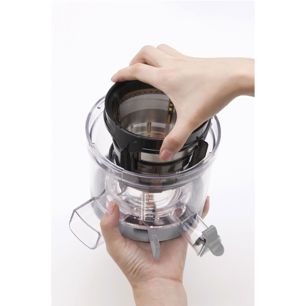 Accessoire(s) inclus : 2 tamis (à trous fins et épais), 2 carafes (pour le jus 1L, pour la pulpe 1.6L), 2 brosses de nettoyage et 1 livre de recettes.