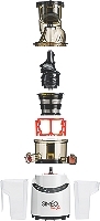 Capacité 0,45 L - 200 Watts Extracteur de jus avec système pressoir 8 programmes automatiques Rotation très lente 45-55tr/min Bol à jus gradué jusqu'à 450 m Goulotte extra large écoulement direct Garantie 2 ans pièces et main d'œuvre