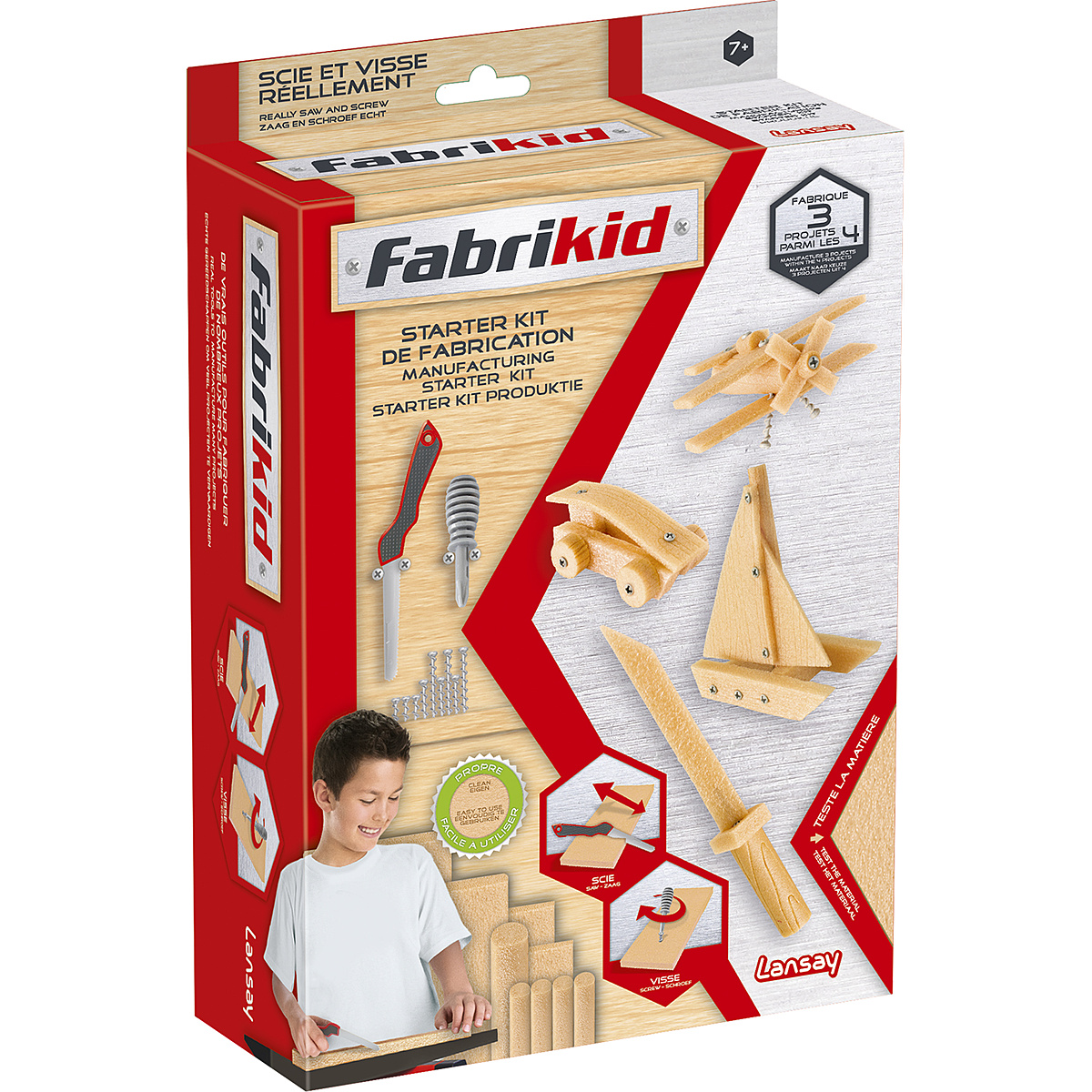 Avec Fabrikid, deviens un véritable bricoleur ! Avec ce starter kit complet de fabrication, tu vas pouvoir te familiariser avec les outils et la matière. Scie et visse tel un véritable bricoleur ! Tu pourras fabriquer facilement au moins 3 projets parmi les 4 projets détaillés dans le livret, dont une un catamaran et un sabre japonais.