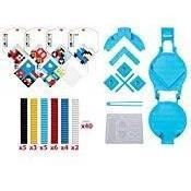 Contenu : 1 moule à gommes, 25 barrettes de gommes colorées (5 bandes de noir, 3 bandes de jaune, 5 bandes de bleu clair, 6 bandes de rouge, 4 bandes de bleu, 2 bandes de blanc), 40 pixels de séparateurs transparents, pinces, 3 séparateurs en forme de cur, 6 partons, 1 feuille vierge, 1 plateau de rangement, 1 notice.