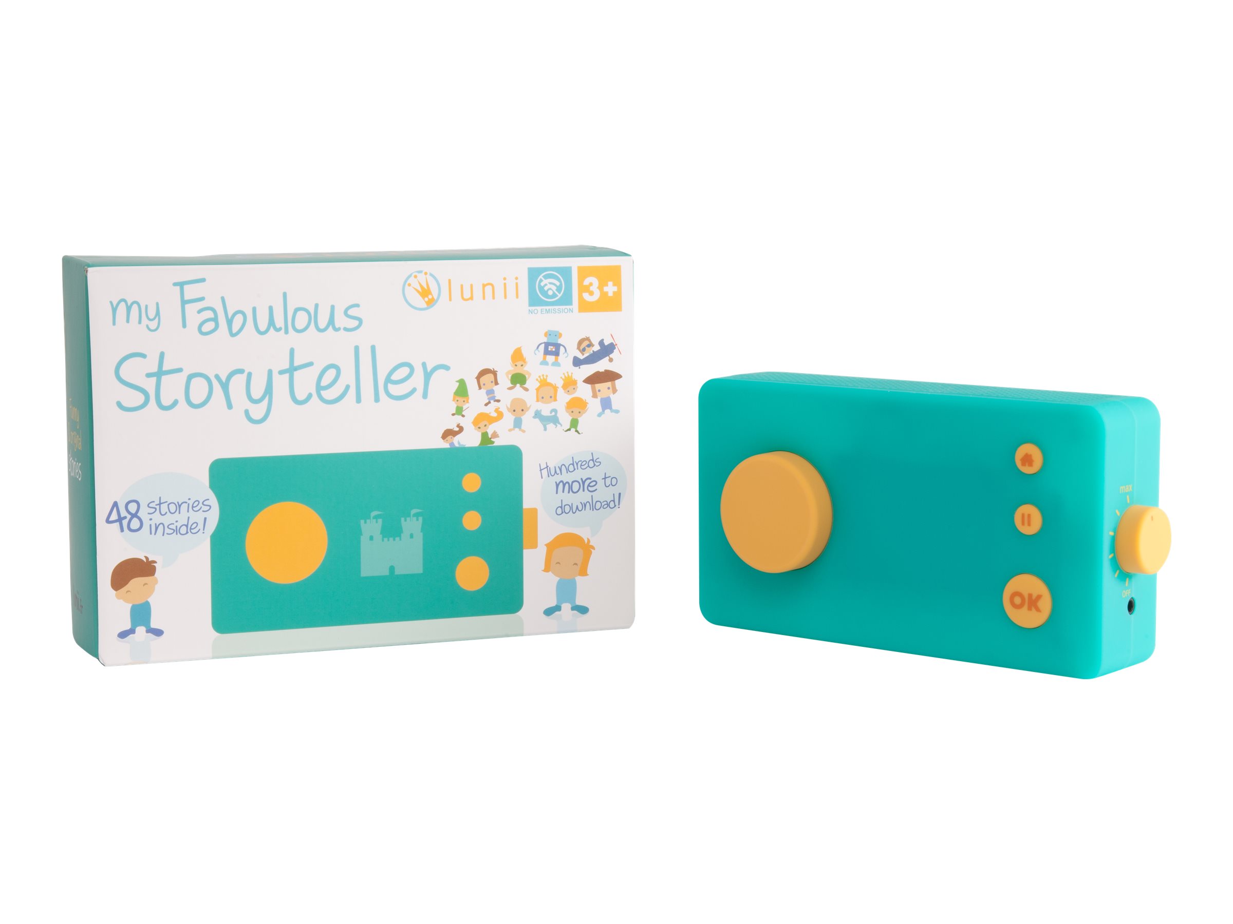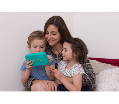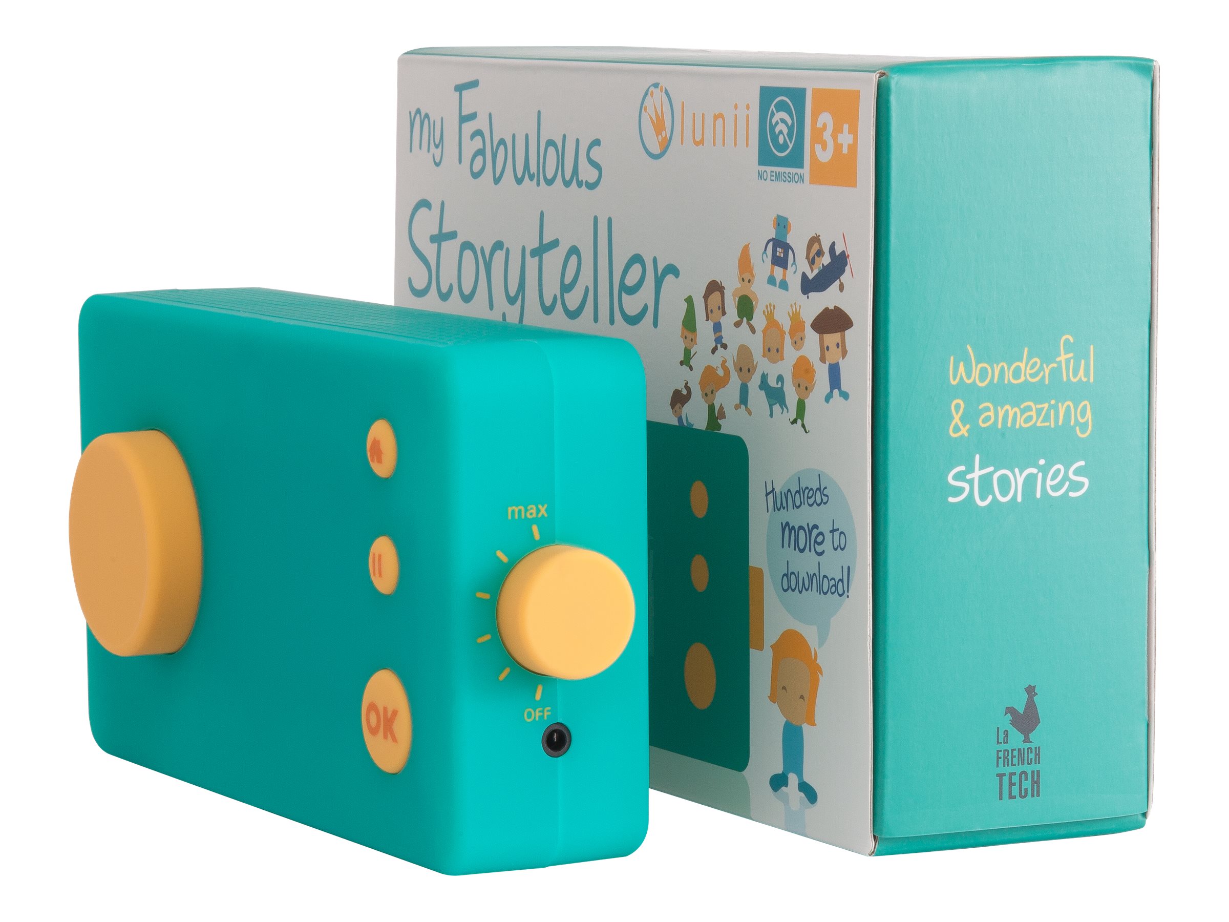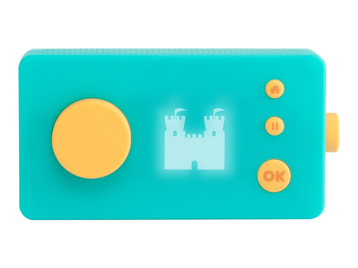 Avec ses couleurs pop, ses matériaux doux au toucher et ses icônes lumineuses, Ma Fabrique à Histoires a presque tout du doudou idéal. Sans ondes et sans écran, ce boîtier au design élégant pourrait bien être le descendant des postes transistors dantan ou des walkmans eighties. Une molette pour le son, et une autre pour choisir ses options : le héros ou lhéroïne, le personnage secondaire, le lieu et un objet.