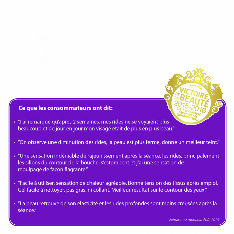 Avec le peu de recul que j’ai, j’arrive à la 5eme seance, je vois déjà un mieux. J’ai la sensation d’avoir la peau moins épaisse au niveau de la ride du lion, le visage moins fripé, les rides atténuées. J’avoue que j’étais pas convaincue mais le résultat est clairement là. Il faut un peu patience pour l’utilisation. 15 min par zone. Mais je prends ça comme un moment de détente devant une série! Et ça vaut le coup ! Seul petit bémol le gel sèche vite et je dois en remettre régulièrement.