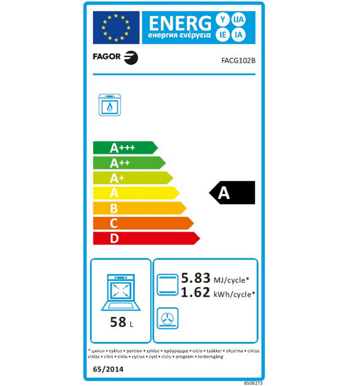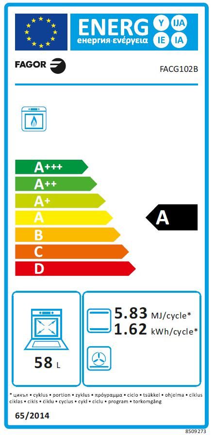 Fagor FACG102B. Type de produit: Cuisinière, Couleur du produit: Noir, Blanc, Type de commande: Rotatif. Type de plaque: Gaz, Nombre de brûleurs: 4 zone(s), Type de gaz: Gaz naturel. Taille du four: Moyenne, Source d'alimentation du four: Electrique, Capacité nette du four: 58 L. Classe d'efficacité énergétique: A. Largeur: 500 mm, Profondeur: 600 mm, Hauteur: 850 mm