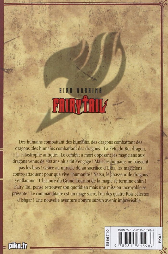 Des humains combattant des humains, des dragons combattant des dragons, des humains combattant des dragons... La Fête du Roi dragon, la catastrophe antique... Le combat à mort opposant les magiciens aux dragons venus de 400 ans plus tôt s'engage ! Mais les humains ne baissent pas les bras ! Grâce au miracle dû au sacrifice d'Ultia, les magiciens contre-attaquent pour que vive l'humanité ! Natsu, le chasseur de dragons s'enflamme ! L'histoire du Grand Tournoi de la magie se termine enfin ! Fairy Tail pense retrouver son quotidien mais une mission incroyable se présente ! Le commanditaire est un mage sacré, l'un des quatre Rois célestes d'Ishgar ! Une nouvelle aventure s'ouvre sur un avenir imprévisible...
