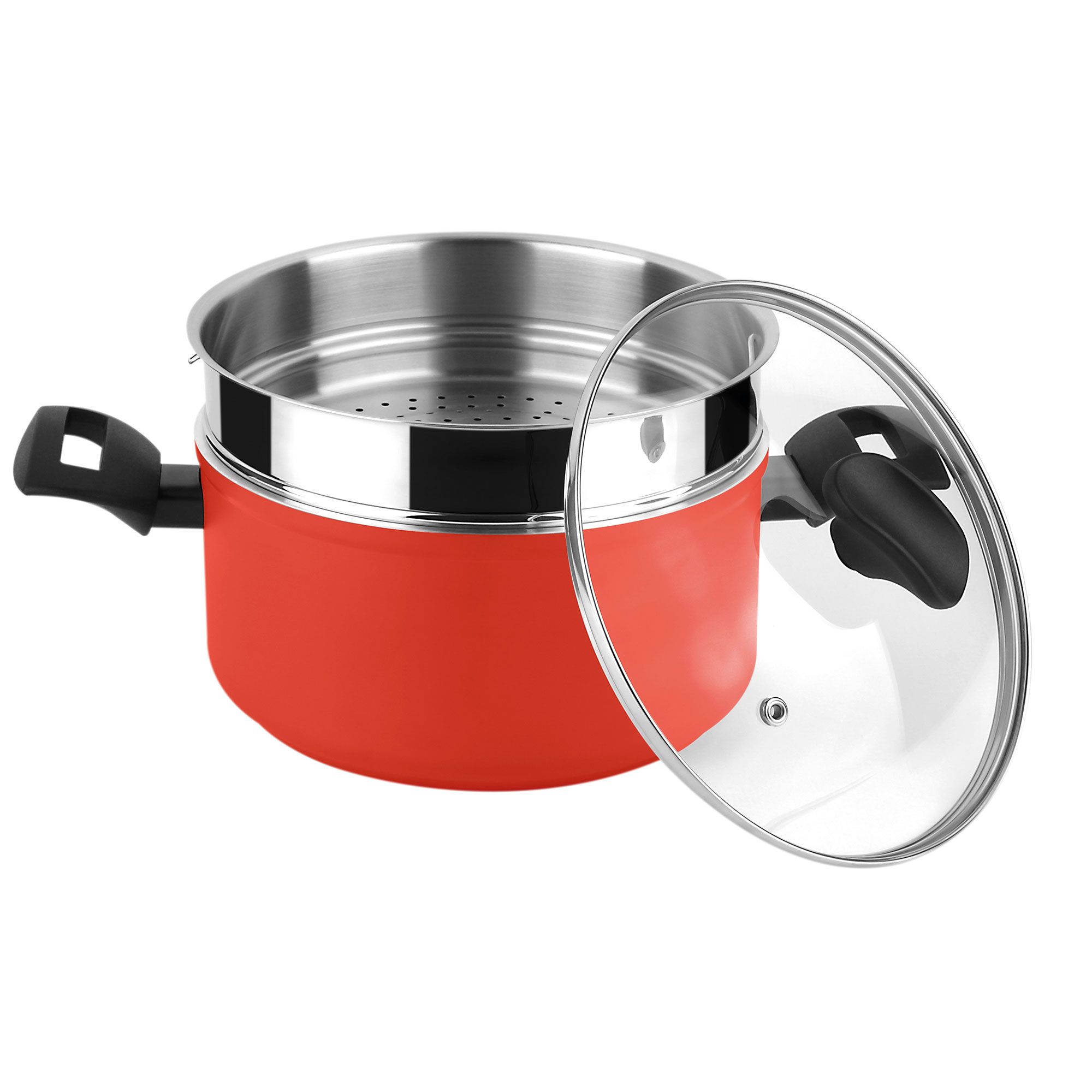 Faitout Vapeur Induction 20 cm, Panier Vapeur en Acier Inox., Couvercle en Verre Rouge FAGORMaxima