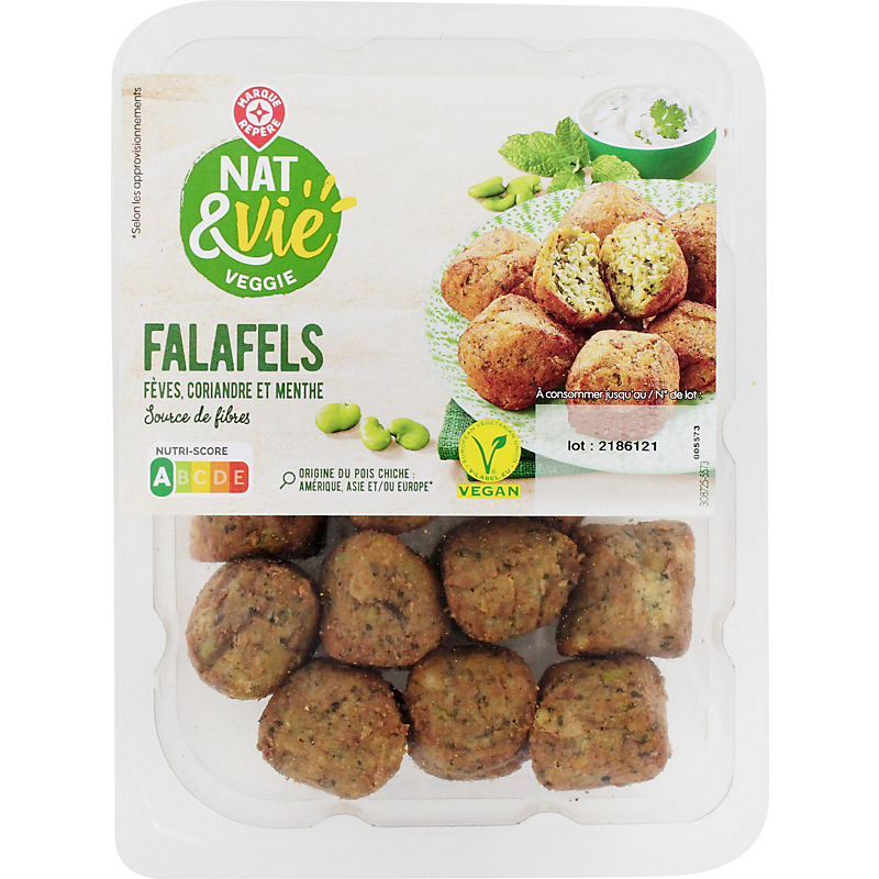 Ingrédients : Pois chiches précuits 45,1 % (eau, pois chiches) ; fèves 12 % ; oignons 11 % ; huiles végétales (colza, tournesol, en proportion variable) ; eau ; farine de blé ; coriandre 3 % ; menthe douce 2,5 % ; amidon de pomme de terre ; fibres végétales (pois, citrus, psyllium) ; conservateur : vinaigre tamponné ; persil ; sel ; cumin ; ail déshydraté ; protéines de pois ; poivre