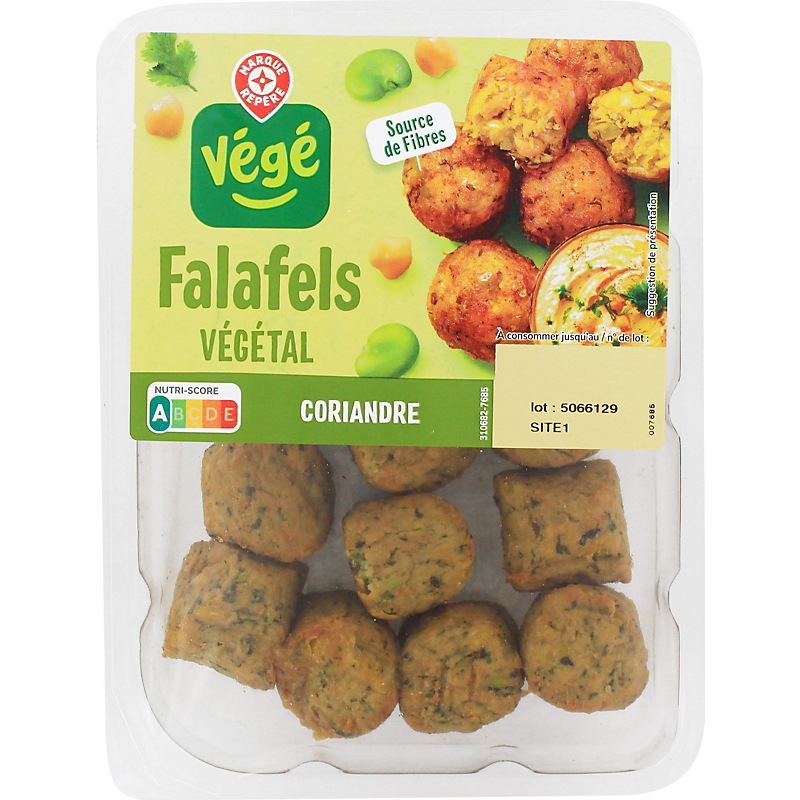 Ingrédients : Pois chiches précuits 45,1 % (eau, pois chiches) ; fèves 12 % ; oignons 11 % ; huiles végétales (colza, tournesol, en proportion variable) ; eau ; farine de blé ; coriandre 3 % ; menthe douce 2,5 % ; amidon de pomme de terre ; fibres végétales (pois, citrus, psyllium) ; conservateur : vinaigre tamponné ; persil ; sel ; cumin ; ail déshydraté ; protéines de pois ; poivre