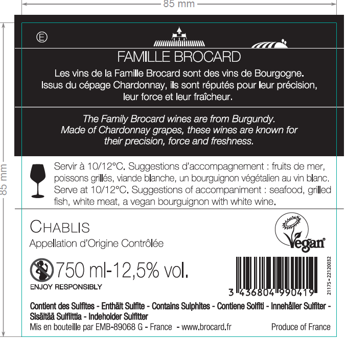 | Libellé | Famille Brocard, 2022 - Chablis AOP - Blanc Sec - 75 cl |