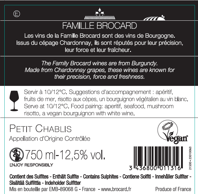 | Libellé | Famille Brocard, 2022 - Petit Chablis AOP - Blanc Sec - 75 cl |
