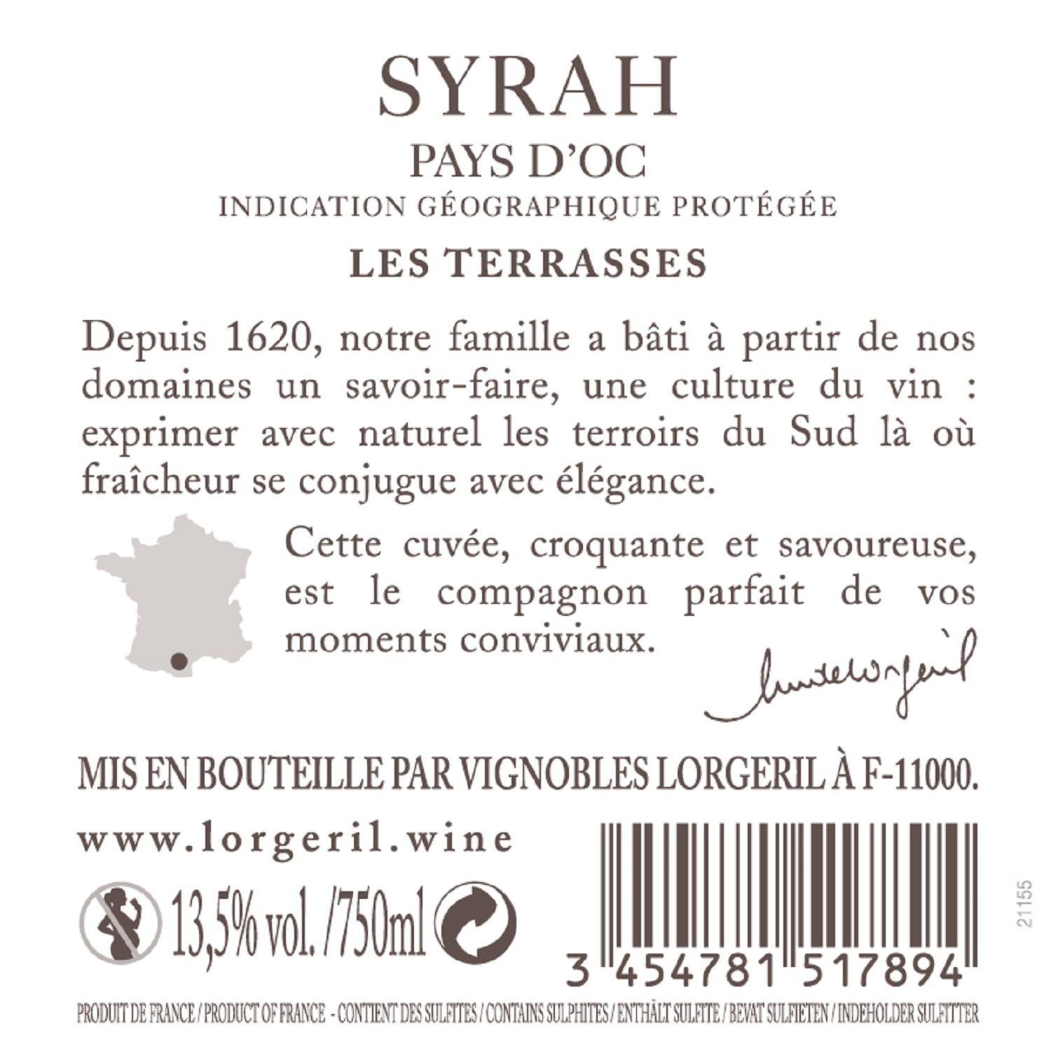 | Libellé | Famille de Lorgeril - Les Terrasses, 2022 - Pays d'Oc IGP - Rouge - 75 cl |