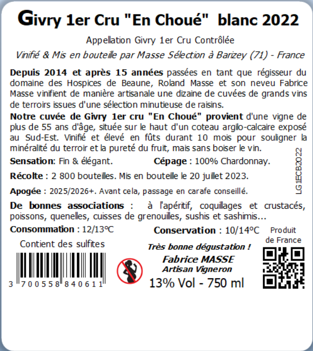 | Libellé | Famille Masse, 2024 - Givry 1er Cru AOP - Blanc Sec - 75 cl |