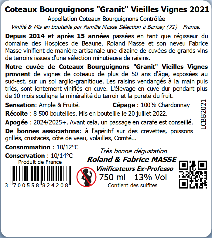 | Libellé | Famille Masse Granit Vieilles Vignes, 2021 - Coteaux Bourguignons AOP - Blanc Sec - 75 cl |