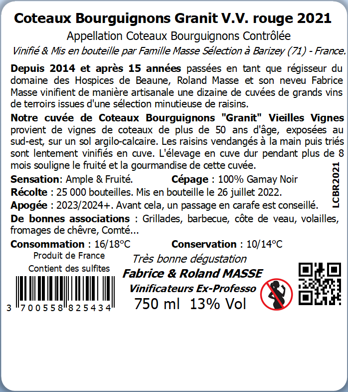 Libellé Famille Masse Granit Vieilles Vignes, 2021 - Coteaux Bourguignons AOP - Rouge - 75 cl