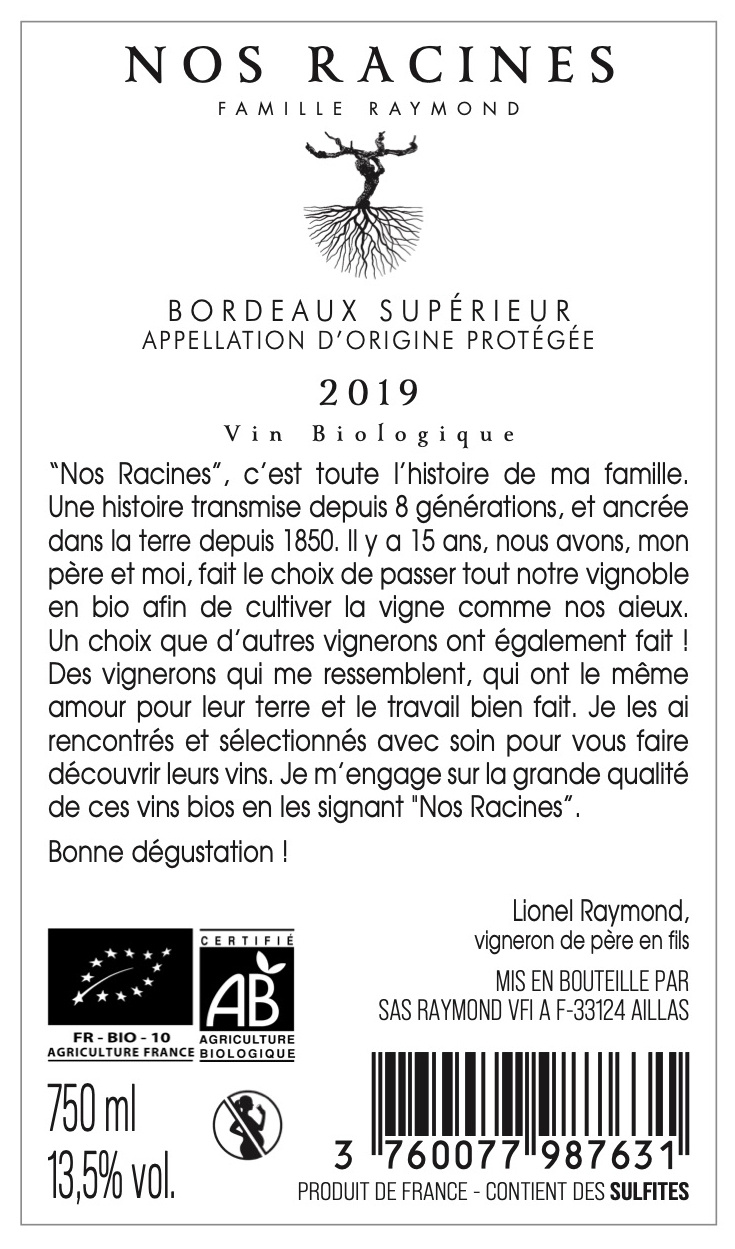| Libellé | Famille Raymond "Nos Racines" BIO, 2021 - Bordeaux Supérieur AOP - Rouge - 75 cl |