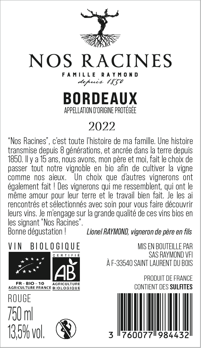 | Libellé | Famille Raymond - Nos Racines BIO, 2022 - Bordeaux AOP - Rouge - 75 cl |
