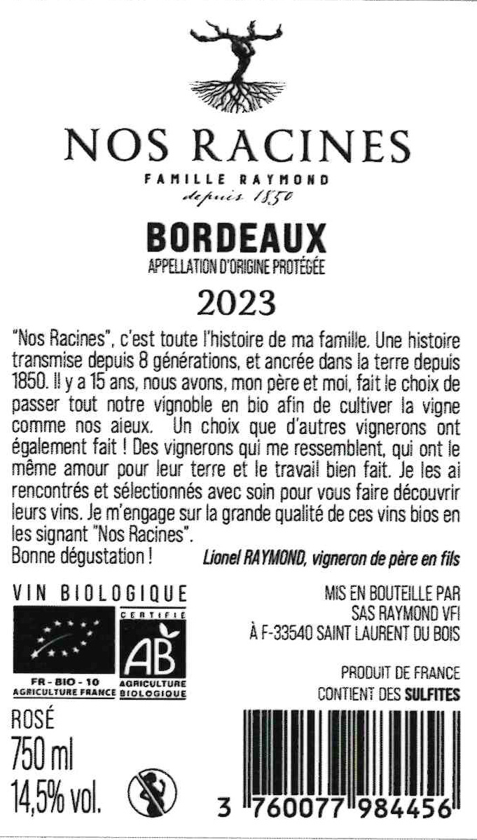 | Libellé | Famille Raymond Nos Racines BIO, 2023 - Bordeaux AOP - Rosé - 75 cl |