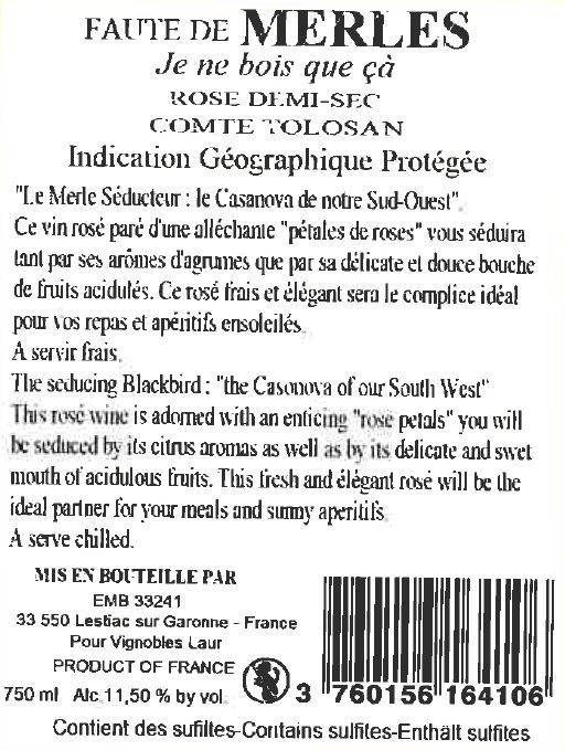 | Libellé | Faute de Merles "Je ne bois que ça" - Comté Tolosan IGP - Rosé - 75 cl |