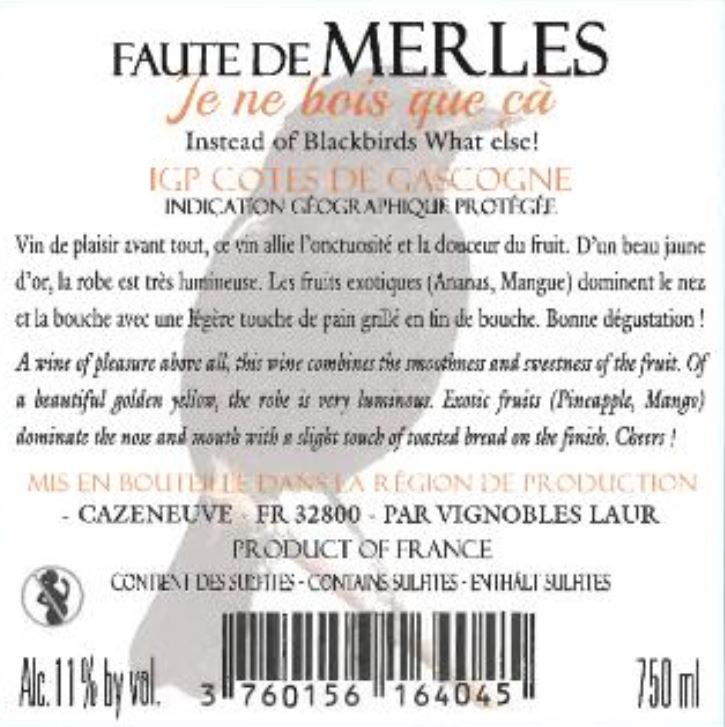 | Libellé | Faute de Merles, Je ne bois que ça - Côtes de Gascogne IGP - Blanc Moelleux - 75 cl |