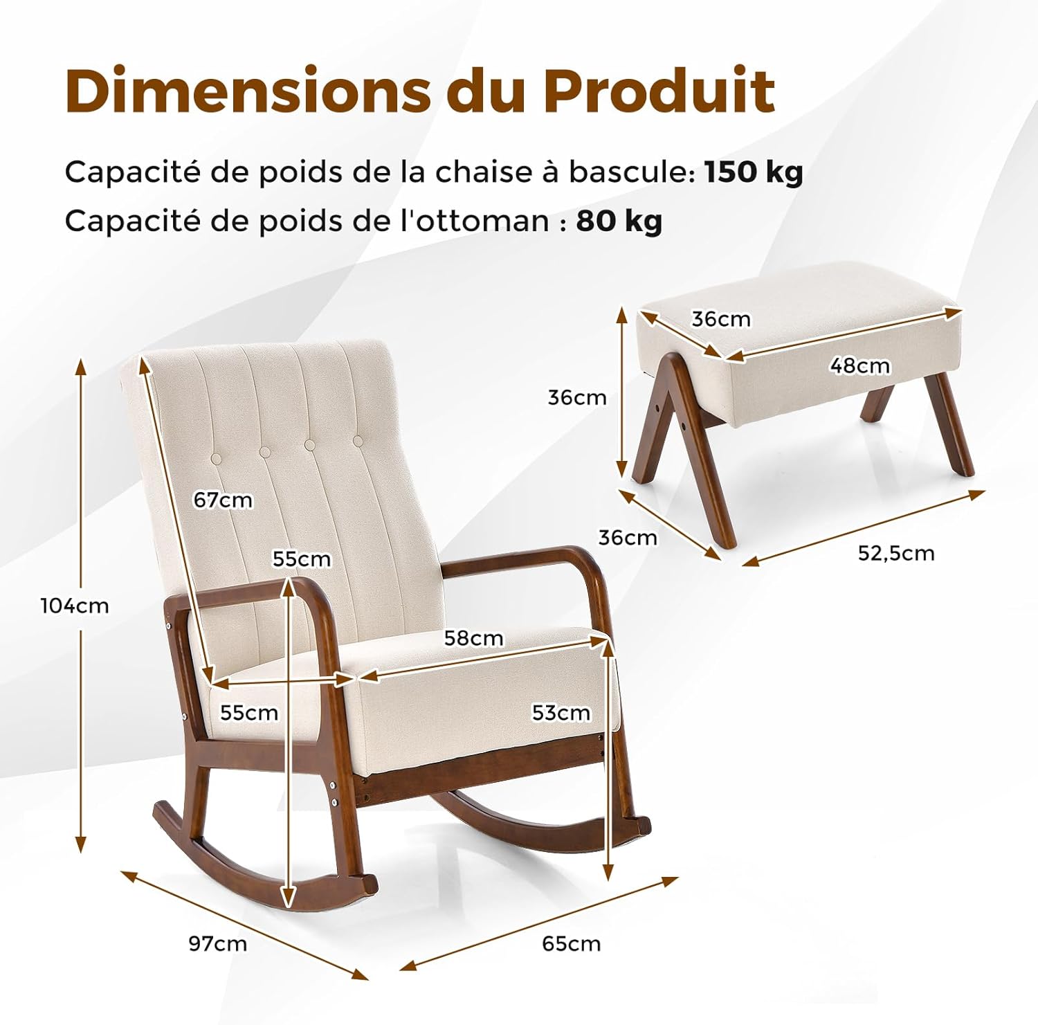 • Assemblage facile : Des instructions détaillées sont incluses pour vous aider à effectuer l'assemblage rapidement et facilement. Toutes les pièces sont numérotées afin que vous puissiez les retrouver facilement. En un rien de temps, vous aurez un rocking-chair durable et robuste avec une capacité de charge allant jusqu'à 150 kg.