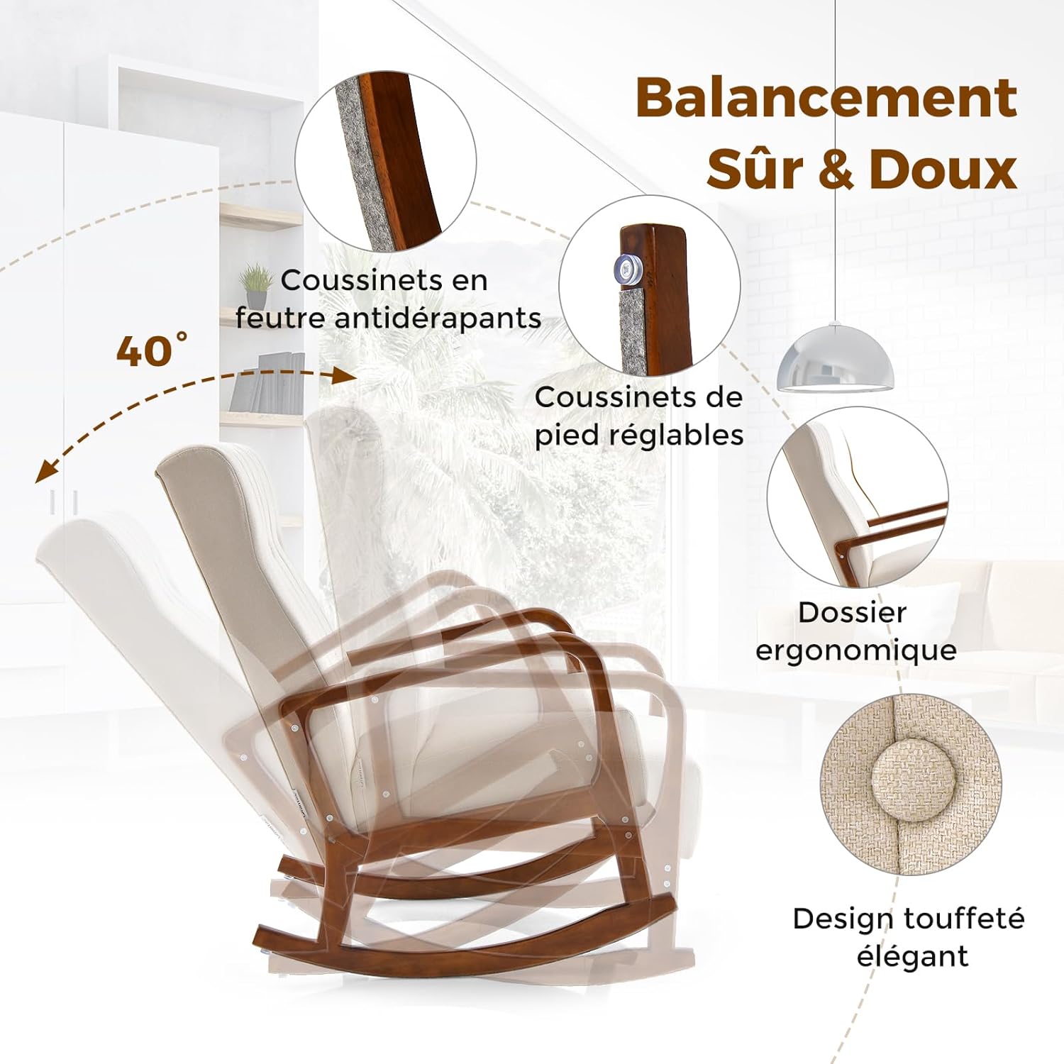 • Balancement relaxant : Ce fauteuil à bascule de conception scientifique s'incline de 14° vers l'avant et de 12° vers l'arrière, pour vous permettre de vous détendre grâce à un mouvement de bascule doux et confortable. En outre, le centre du corps est toujours au milieu lors du balancement, ce qui garantit une sécurité maximale pendant l'utilisation.
