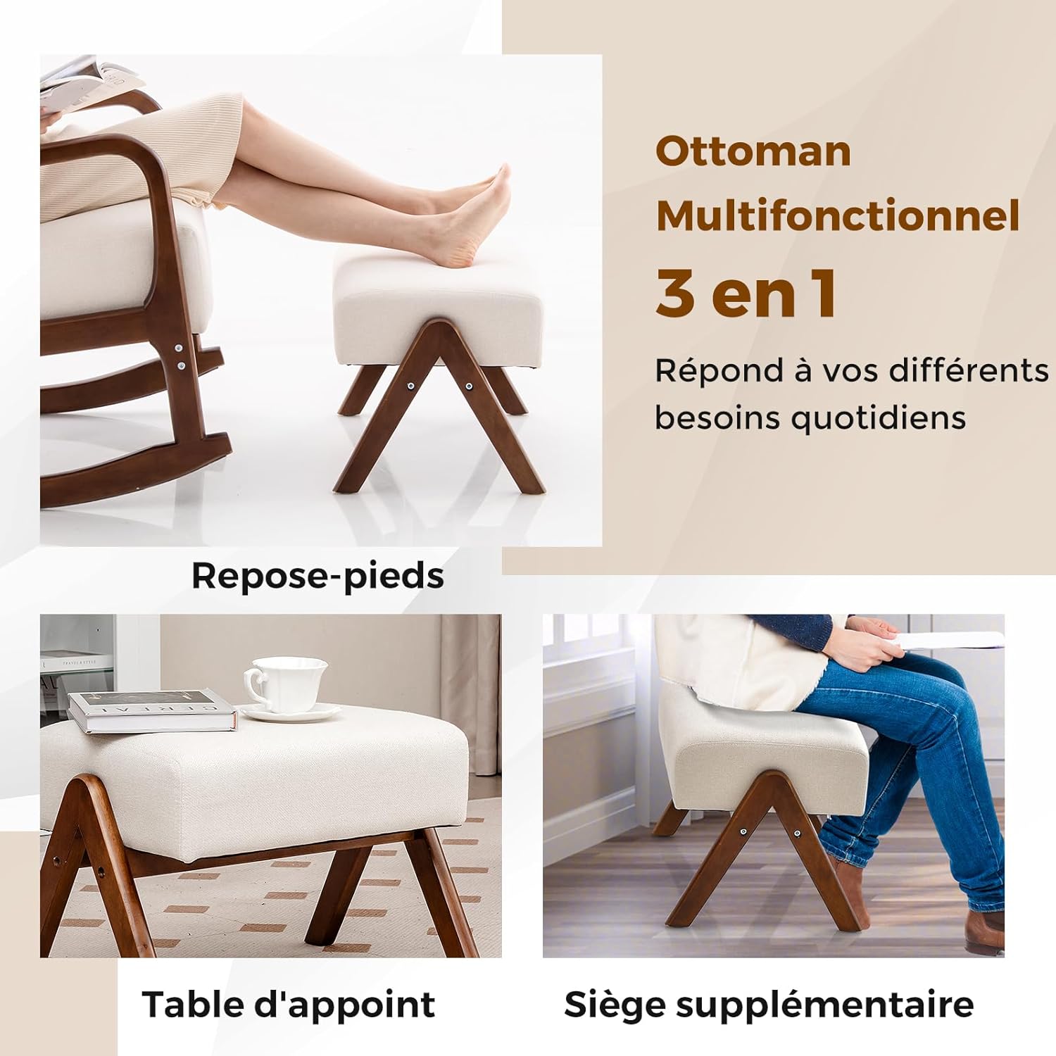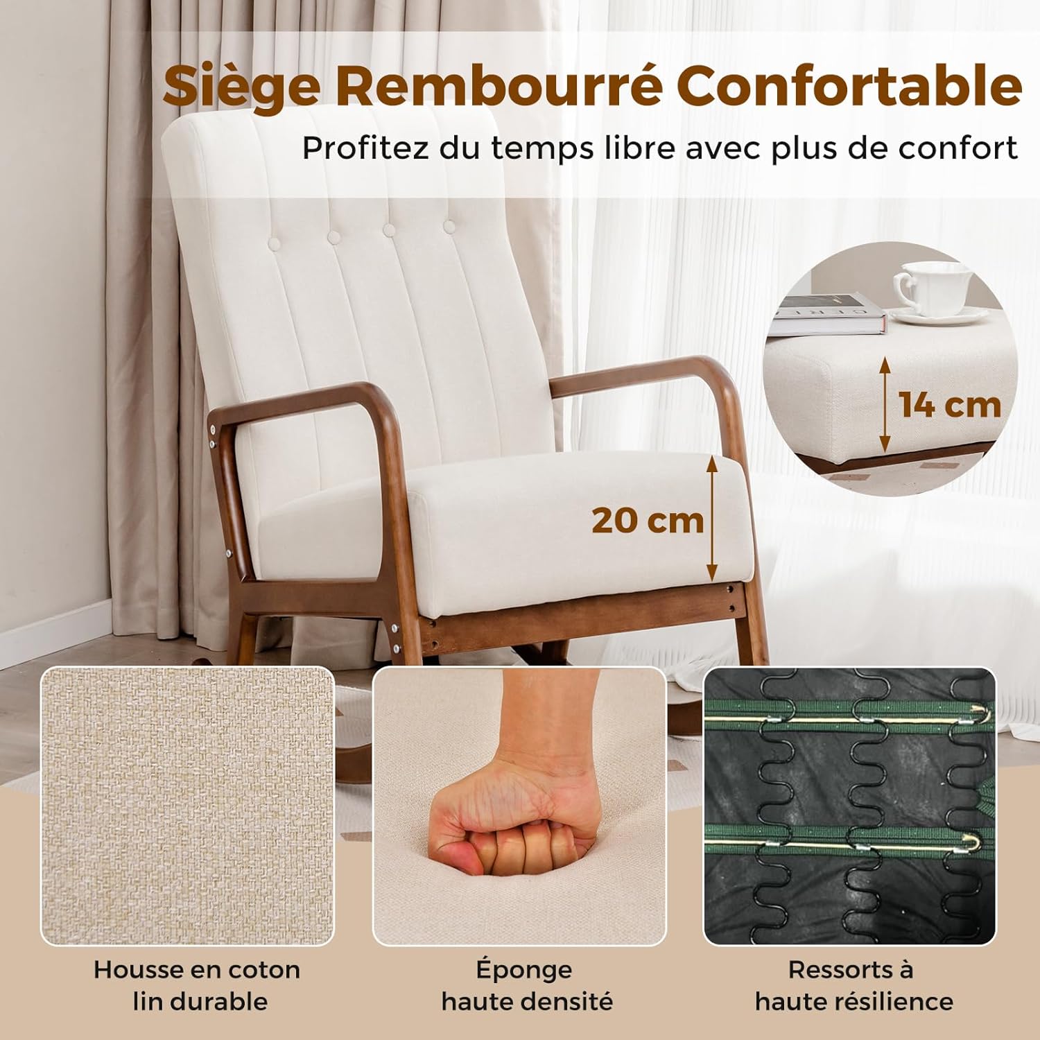 • Un look élégant et raffiné : La combinaison harmonieuse d'un cadre en bois massif d'hévéa, de rotin PE tressé et d'une housse beige douce donne à ce rocking-chair un look attrayant et élégant. Il s'agit d'un complément idéal pour votre patio, votre jardin et votre balcon, vous permettant de profiter de votre temps libre dans le confort et la détente.