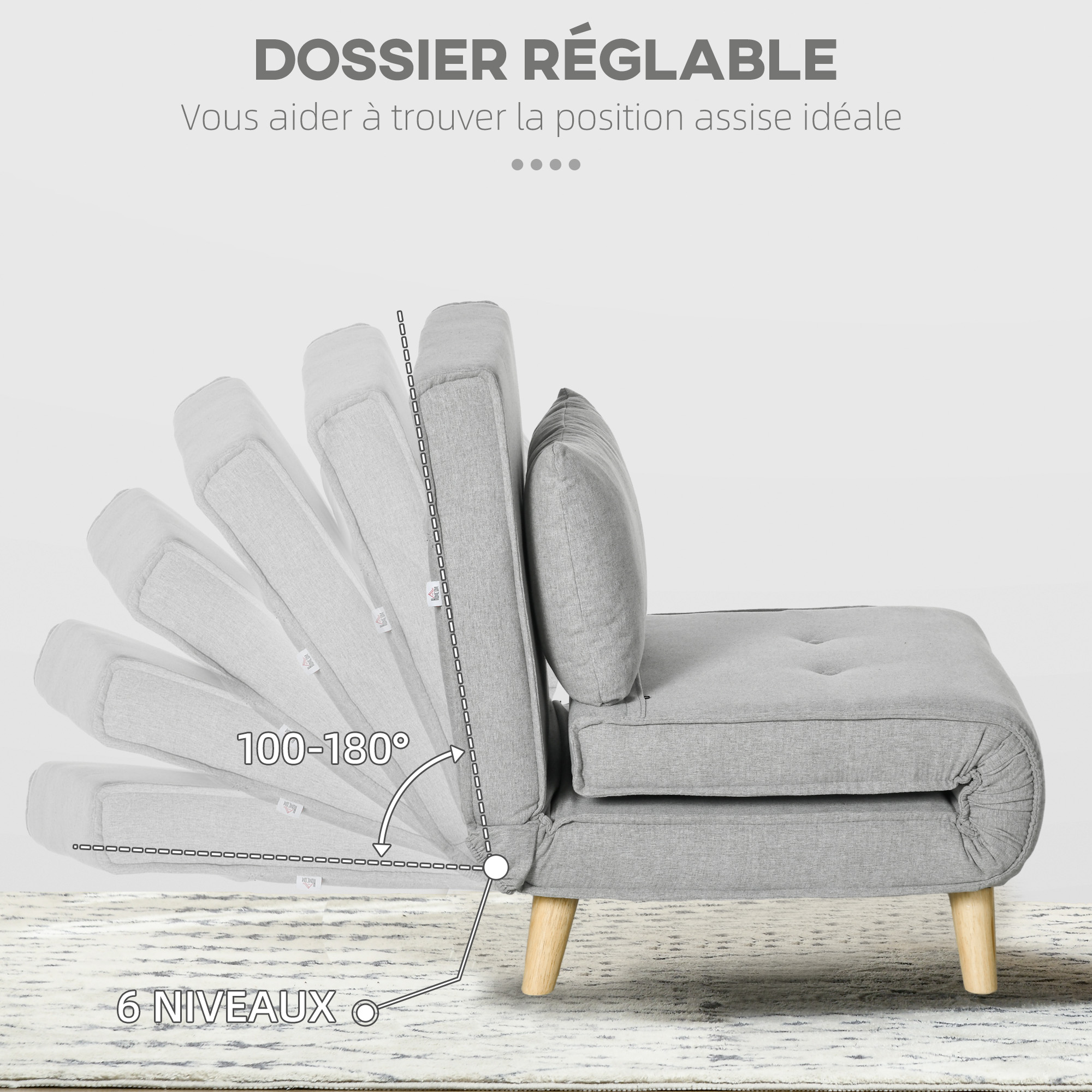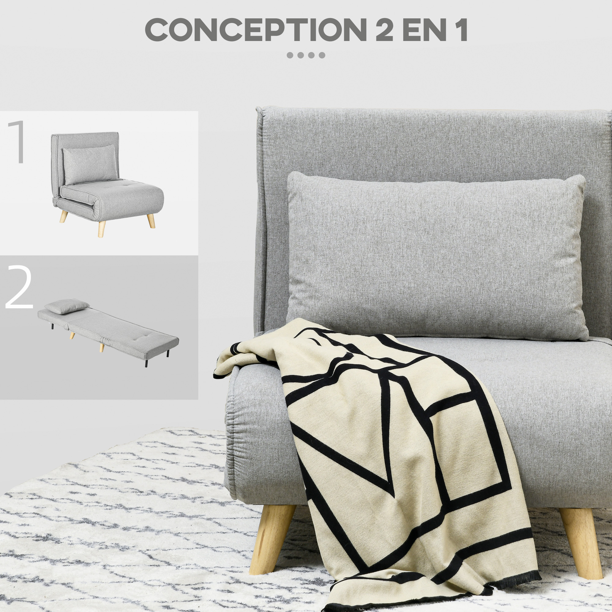 Fauteuil chauffeuse canapé-lit convertible 1 place - coussin inclus - style scandinave tissu gris clair