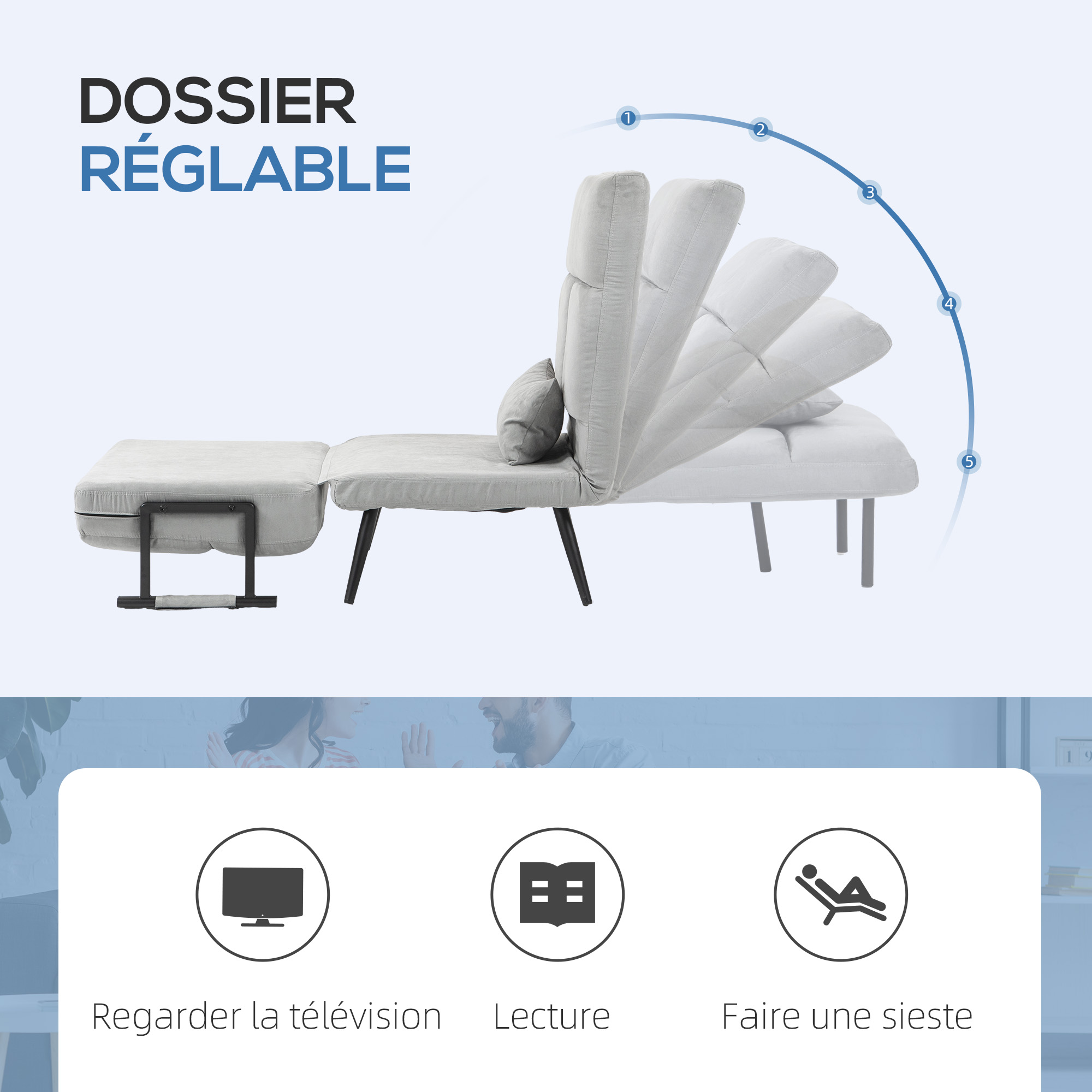 - Ce canapé convertible en tissu peut être utilisé comme fauteuil, méridienne ou lit simple