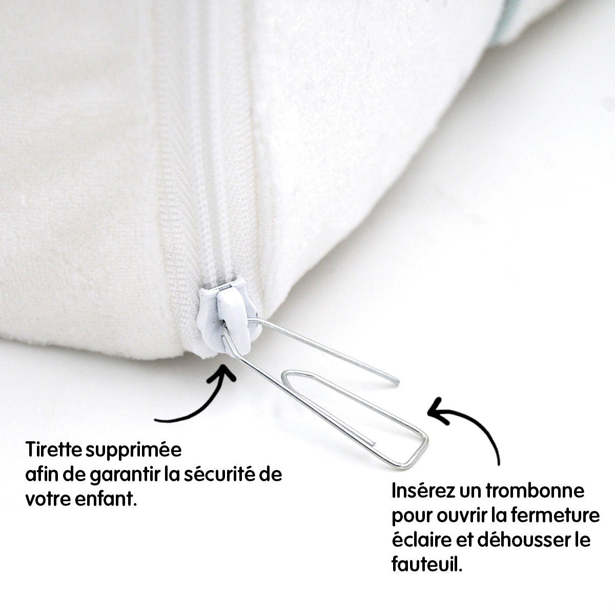 IMPORTANT ! À LIRE ATTENTIVEMENT ET À CONSERVER EN VUE D'UNE CONSULTATION ULTÉRIEURE.AVERTISSEMENT ! Ne pas placer ce produit à proximité d'une fenêtre, car il peut servir de marchepied à l'enfant et entraîner sa chute par la fenêtre.Tenir compte des risques engendrés par la présence de foyers ouverts ou autres sources de chaleur à proximité immédiate du produit. Ne pas placer ce produit à proximité d'une fenêtre où les cordons de stores ou de rideaux pourraient étrangler un enfant.Pour la sécurité de bébé, la tirette de la fermeture à glissière a volontairement été supprimée. Pour déhousser le produit, il suffit d'actionner le curseur à l'aide d'une tige métallique, un trombone par exemple.Ne pas utiliser le siège si une pièce est cassée, déchirée ou manquante et utiliser uniquement des pièces de rechangeapprouvées par le fabricant.