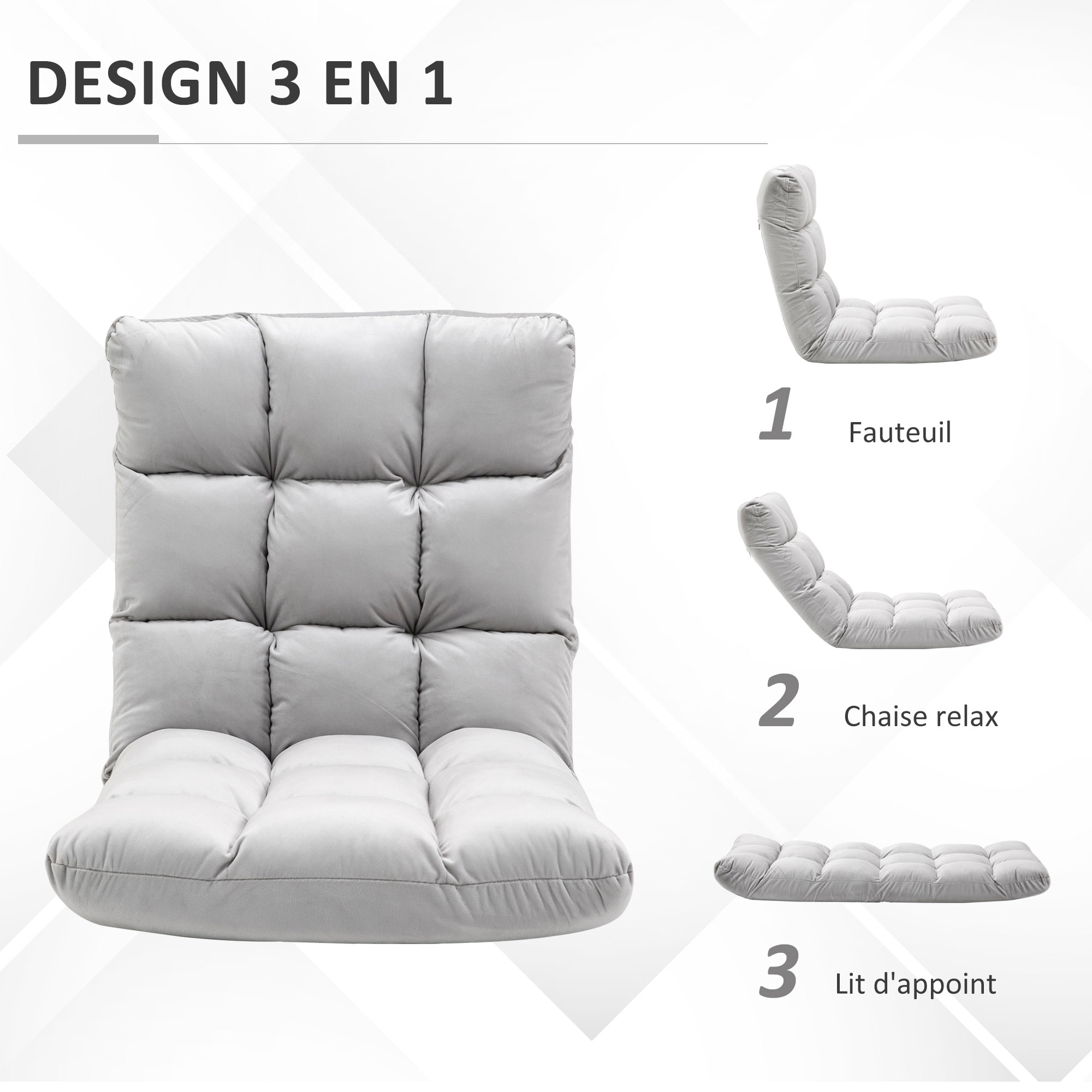 | Libellé | Fauteuil convertible fauteuil paresseux grand confort inclinaison dossier multipositions 90°-180° flanelle polyester capitonné gris clair |
