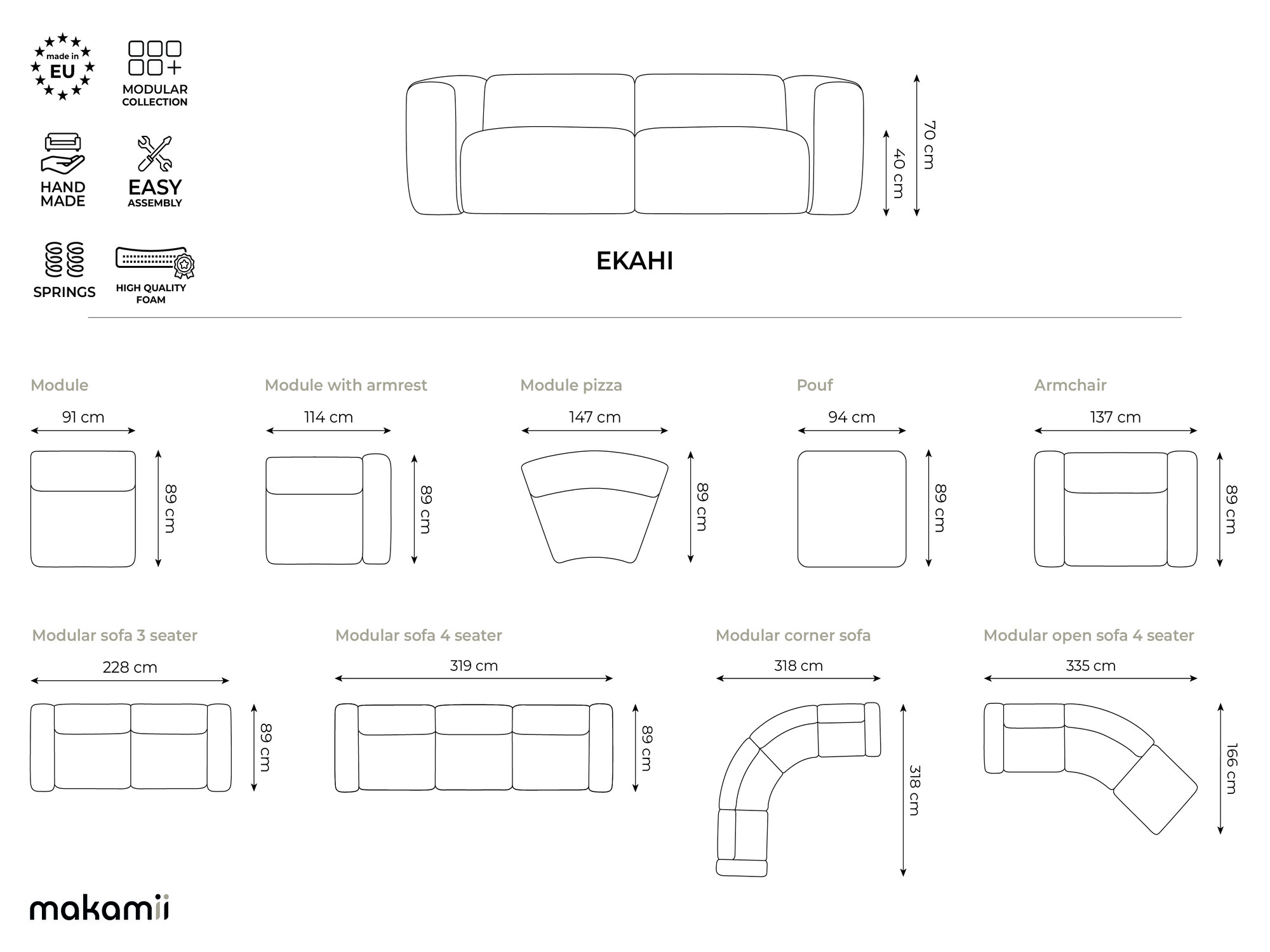 Le module de canapé d'angle Ekahi offre une solution flexible et élégante pour ceux qui souhaitent personnaliser leur espace de vie. Avec une largeur de 147 cm et une hauteur d’assise de 40 cm, ce module est conçu pour un confort optimal et une utilisation polyvalente dans des configurations de canapé d'angle ou en ajout d'un siège supplémentaire. Sa structure solide, composée de panneaux de particules, de bois tendre et de ressorts ondulés, garantit un maintien robuste et une durabilité exceptionnelle. Le tissu chenille de haute qualité ajoute une touche de luxe à votre espace tout en assurant une résistance à l'usure et au boulochage, testée pour une résistance Martindale de 80 000 cycles. Ce tissu doux est également conçu pour résister aux taches et aux décolorations, ce qui en fait un choix idéal pour les familles et les espaces de vie fréquentés.
