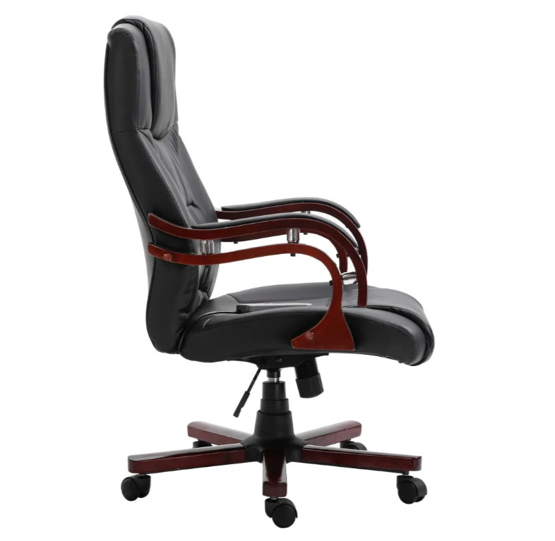 Très beau modèle de fauteuil de bureau en PU de couleur noir avec accoudoir et base en bois courbé de la collection Tolou avec réglage progressif en hauteur par vérin à gaz. Mécanisme pivotante sur 360 degrés assure un niveau de mouvement accru. Équipé de roulettes Diamètre des roulettes en nylon : 50 mm Avec un système de levage à gaz de 100 mm Hauteur et dossier ajustables