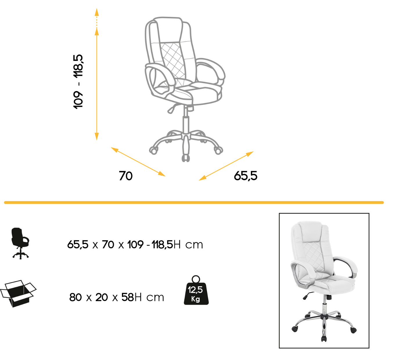 Découvrez notre fauteuil de bureau à dossier haut, conçu pour allier confort et esthétique. Ce fauteuil au design moderne est idéal pour décorer n'importe quelle pièce, apportant une touche sophistiquée et élégante à votre maison ou bureau, en parfaite harmonie avec les tendances actuelles en matière de décoration. Design Sophistiqué : Avec son revêtement en PU blanc et ses coutures sur le dossier, ce fauteuil se démarque par son design élégant, parfait pour sublimer n'importe quel espace. Polyvalence Fonctionnelle : Ce fauteuil polyvalent s'intègre parfaitement dans diverses pièces à vivre ou bureaux, ajoutant une touche de modernité et de chaleur à votre environnement. Confort et Esthétique Réunis : Son design, associé à la finition en PU et aux pieds en acier chromé de type "araignée", offre une combinaison parfaite entre modernité et confort, qu'il s'agisse de votre salon ou de votre bureau. Confort Exceptionnel : La taille de l'assise et du dossier, ainsi que son design ergonomique, vous garantissent un confort optimal et une grande commodité, sans sacrifier le style. Avec des dimensions de L 65,5 x H 109/118,5 x P 70 cm et la possibilité de réglage de la hauteur, ce fauteuil est l'option idéale pour combiner style, polyvalence, confort et modernité dans votre espace.