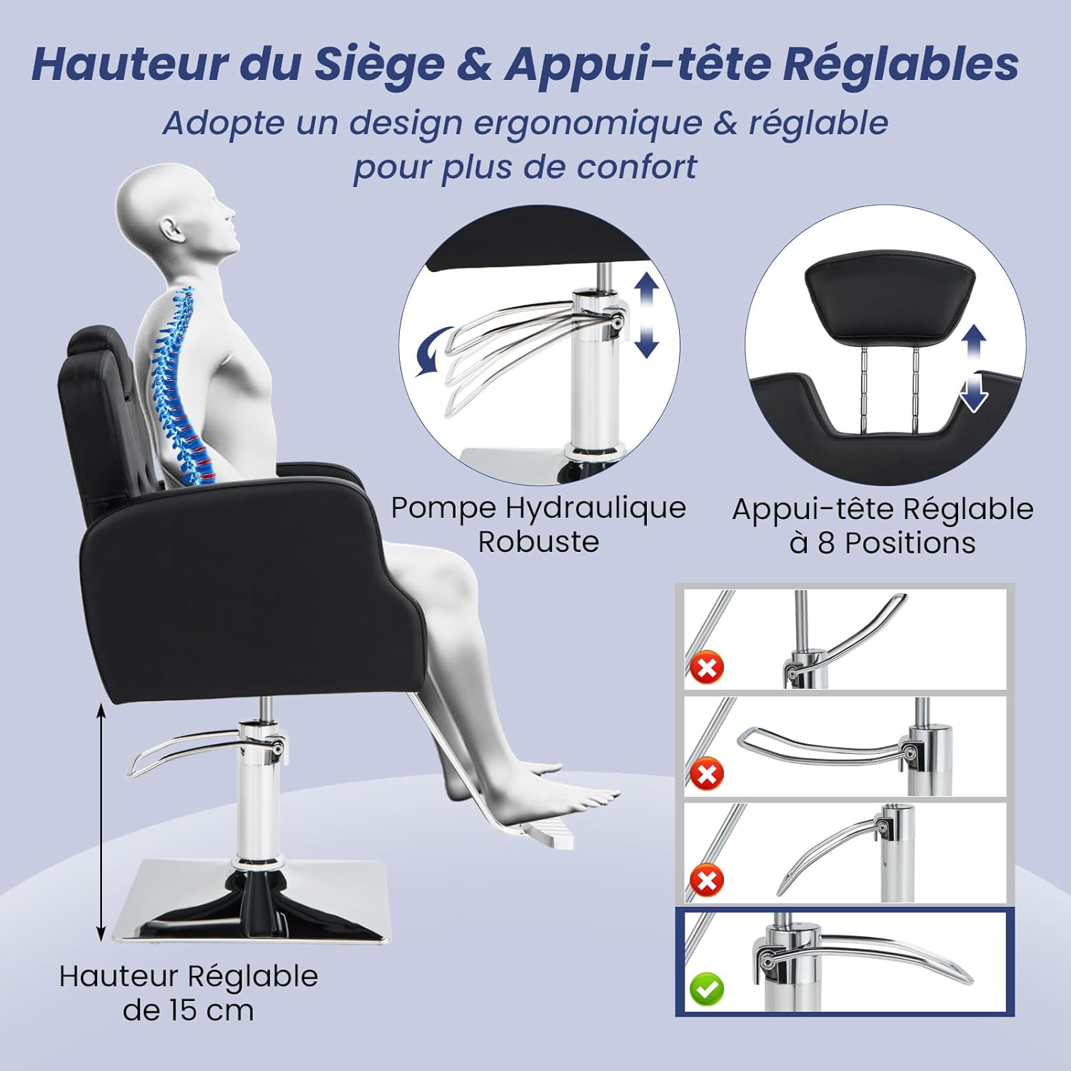 Ce fauteuil de coiffure élégant et moderne sera le meilleur choix pour votre salon ! Il est doté d'une assise réglable en hauteur (54,5 cm - 69,5 cm) via le repose-pieds, d'un appui-tête réglable en hauteur, d'une mousse élastique pour le soutien des hanches, d'un dossier haut, d'accoudoirs semi-fermés et d'un large repose-pieds pour un confort inégalé. Le dossier haut, les accoudoirs semi-fermés et le large repose-pieds offrent un confort inégalé et peuvent être pivotés à 360 degrés si nécessaire. La pompe hydraulique haute performance permet de régler la hauteur dans une plage de 15 centimètres. En outre, le cuir PVC est résistant, imperméable et facile à nettoyer. La large base carrée assure un support stable et rend la chaise de mannequin moins sujette aux secousses.