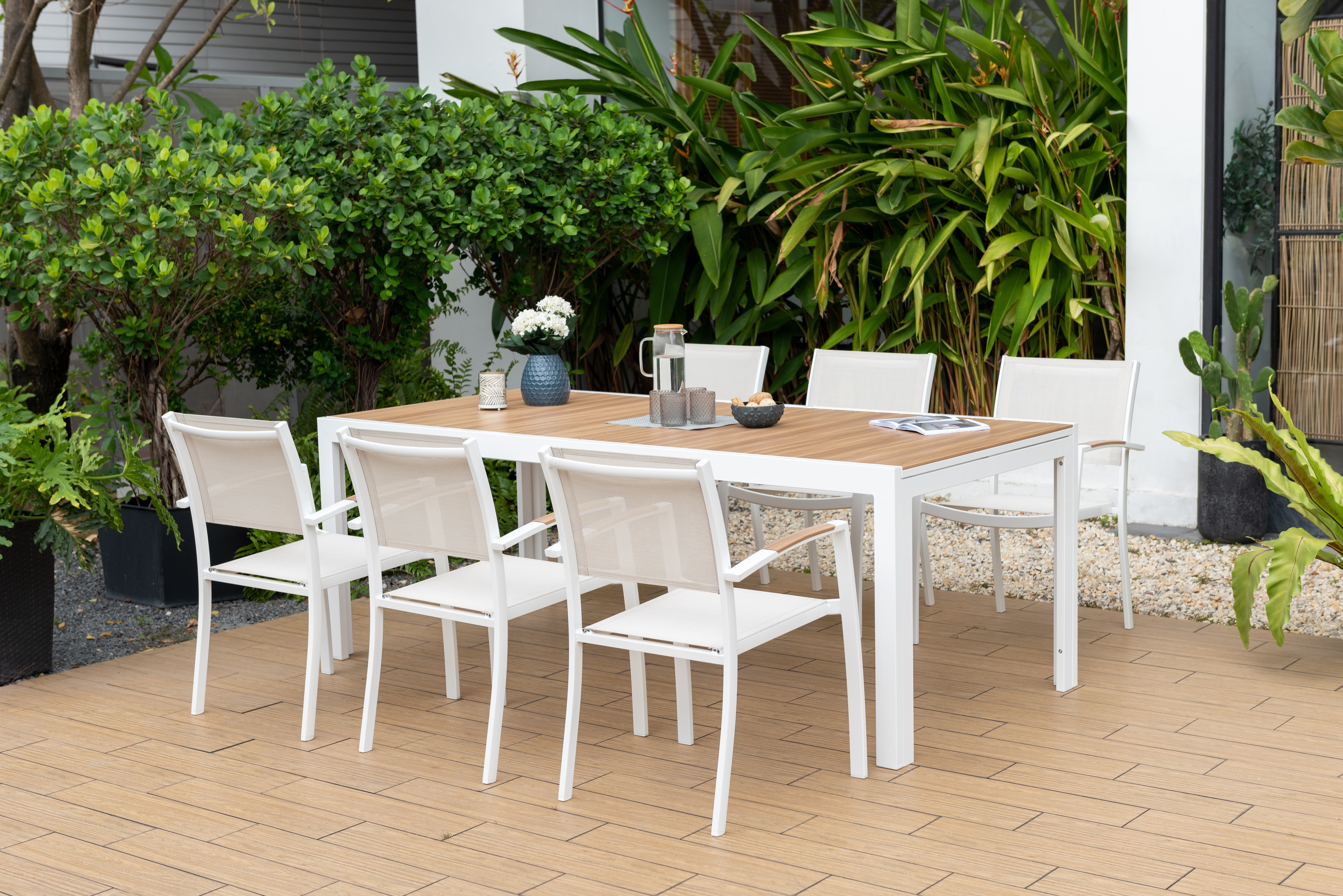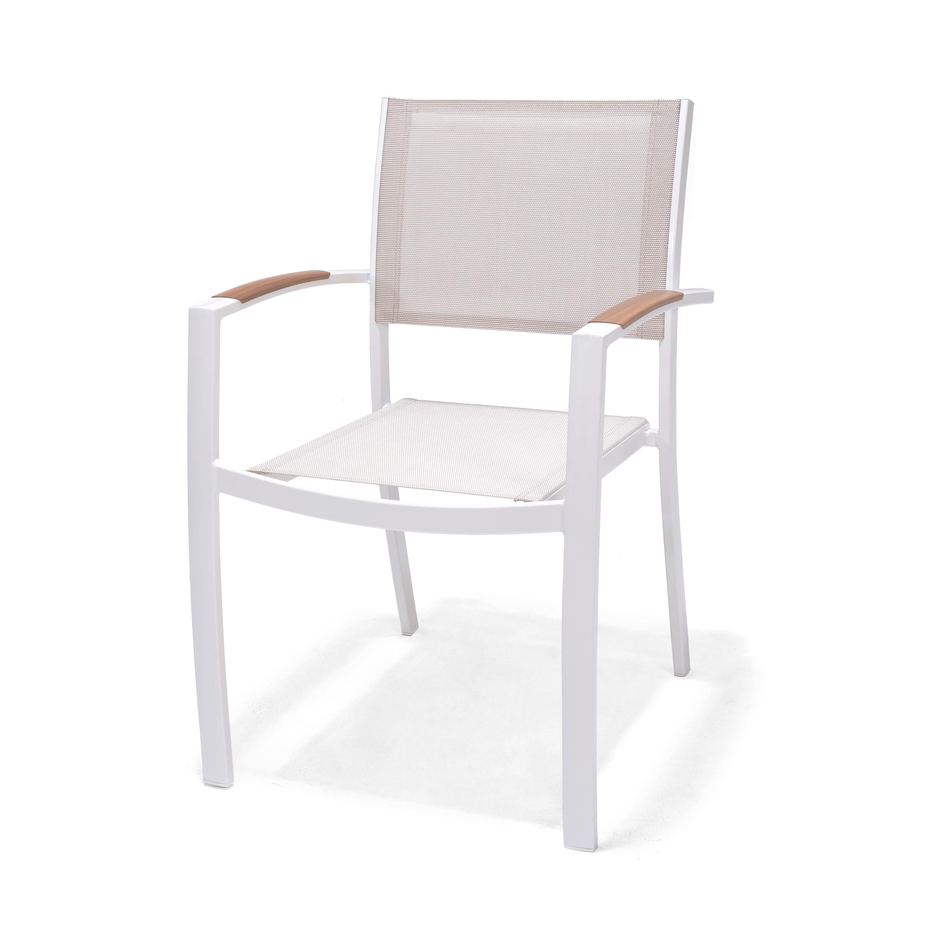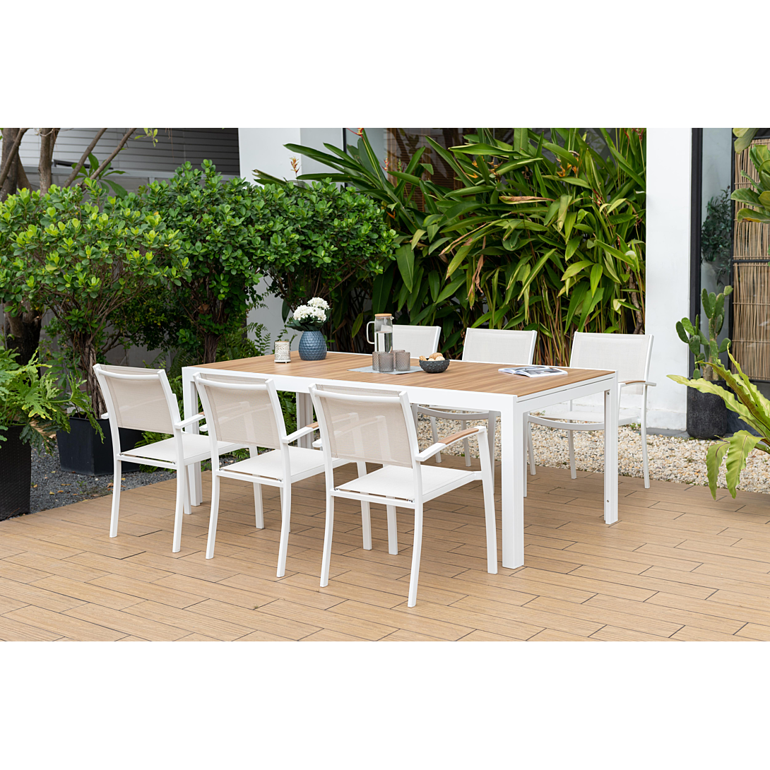 Ce fauteuil de jardin arbore un design moderne avec une structure en aluminium de coloris blanc qui combine à la fois solidité et légèreté. Les accoudoirs en aluminium imitation teck apportent une touche de chaleur et d'élégance à l'ensemble. Le siège en toile enduite PVC de couleur beige chiné offre une assise confortable et respirante. Il peut supporter une charge maximale de 160 kg. La praticité est au rendez-vous avec ce fauteuil empilable. Rangez-le aisément lorsqu'il n'est pas utilisé, maximisant ainsi l'espace de stockage. Ce fauteuil est résistant aux intempéries et se nettoie facilement avec un chiffon humide et de l'eau savonneuse. Il est garantie 2 ans et répond aux normes européennes. Dimensions du fauteuil : L.57.60 x l.55.70 x h.84.50 cm. Hauteur de l'assise : 44,5 cm.
