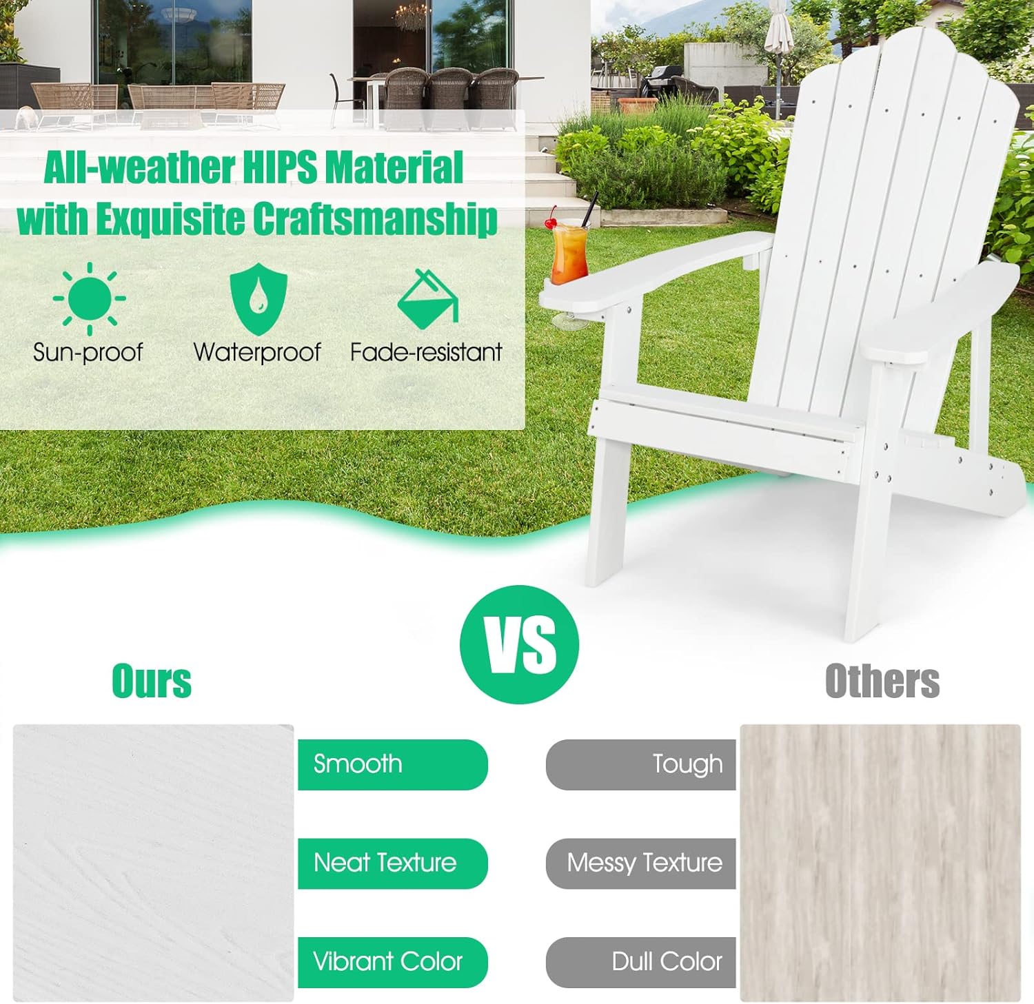 - Structure stable : Conçu en HIPS de haute qualité, notre chaise adirondack est à la fois robuste, résistant aux intempéries et idéal pour une utilisation en extérieur. Avec une capacité de charge maximale de 150 kg, il vous assure une assise sûre et confortable pour profiter pleinement de vos espaces extérieurs sans souci.