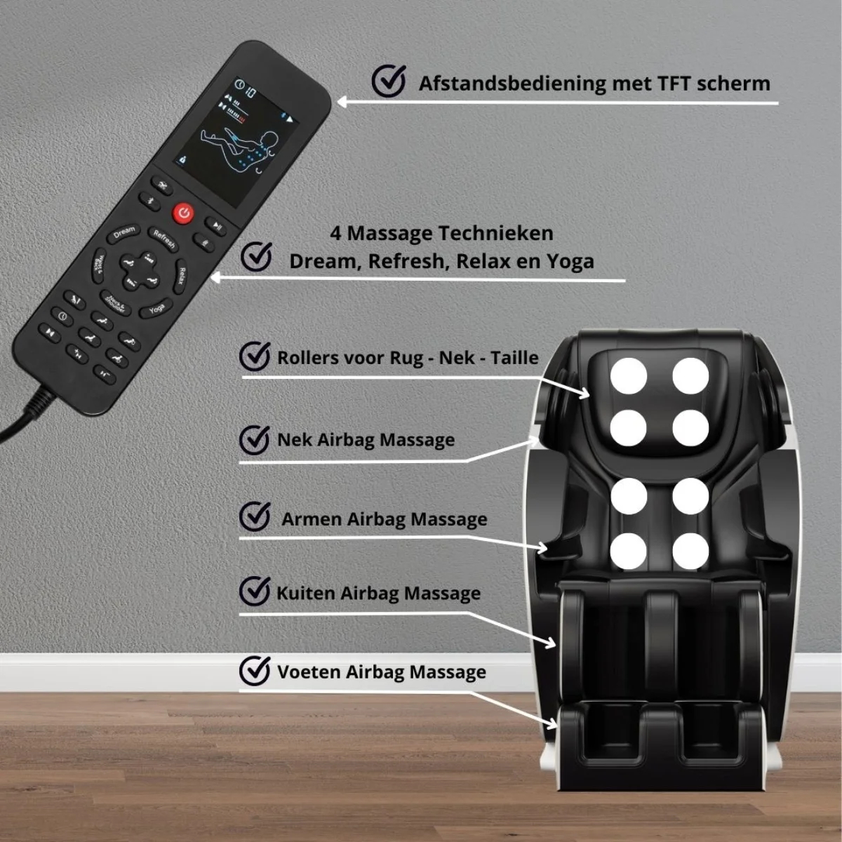 Avec le fauteuil de massage NRG Wellness Deluxe, vous pouvez profiter d'un merveilleux massage chez vous et rêver tout en écoutant votre musique préférée. L'ensemble du corps est massé à l'aide de pas moins de 14 rouleaux différents. Choisissez parmi l'une des nombreuses options prédéfinies pour vous détendre complètement ou pour masser des parties spécifiques du corps. Pour l'effort ultime, il existe le mode Zero Gravity dans lequel la chaise s'incline presque complètement horizontalement pour que vous puissiez vous détendre complètement. Un aperçu des fonctionnalités importantes : → Certifié CE → Support de télécommande→ 14 rouleaux pour masser tout le dos → Massage du haut du corps avec compression airbag et rouleaux de massage → Roues de transport à l'arrière pour un déplacement facile→ 90 % pré-assemblé hors de la boîte. Seule la partie pied doit être démontée. Aucun outil requis. → Disponible en noir ou blanc Équipé des fonctions suivantes : Zéro gravité dans deux modes différents 6 programmes automatiques Télécommande avec écran TFT Intensité réglable Pression et vitesse réglables Mode veille avec option berceau Chauffage arrière Massage complet du corps avec airbags Rouleaux pour le cou, le dos et la taille Massage avec airbag cervical Massage avec airbag d'épaule Massage des bras avec airbag Airbags de hanche Massage airbag mollet Massage avec airbag à la taille Massage des pieds avec airbag Support de jambe réglable de 0 cm à 16 cm pour les personnes mesurant jusqu'à 195 cm Massage avec airbag dorsal 4 techniques de massage différentes : Dream, Refresh, Relax et Yoga Scan physique (ectomorphe, mésomorphe ou endomorphe) – pour les utilisateurs mesurant entre 1 58 cm et 195 cm Massage des pieds au rouleau Connexion Bluetooth pour écouter de la musique Haut-parleurs hi-fi intégrés Alimentation : 110 V/220 V Dimensions et spécifications du fauteuil de massage : Construit normal (L x l x H en cm) : 140 x 78 x 110 Aménagement plat (L x l x H en cm) : 173 x 78 x 88 Poids net : 80 kg Dimensions de la boîte (L x l x H en cm) : 143 x 79 x 89 Poids brut : 96 kg Poids maximum de l'utilisateur : 120 kg Fréquence : 50 à 60 Hz Consommation électrique : 90 W (0,09 KWh)