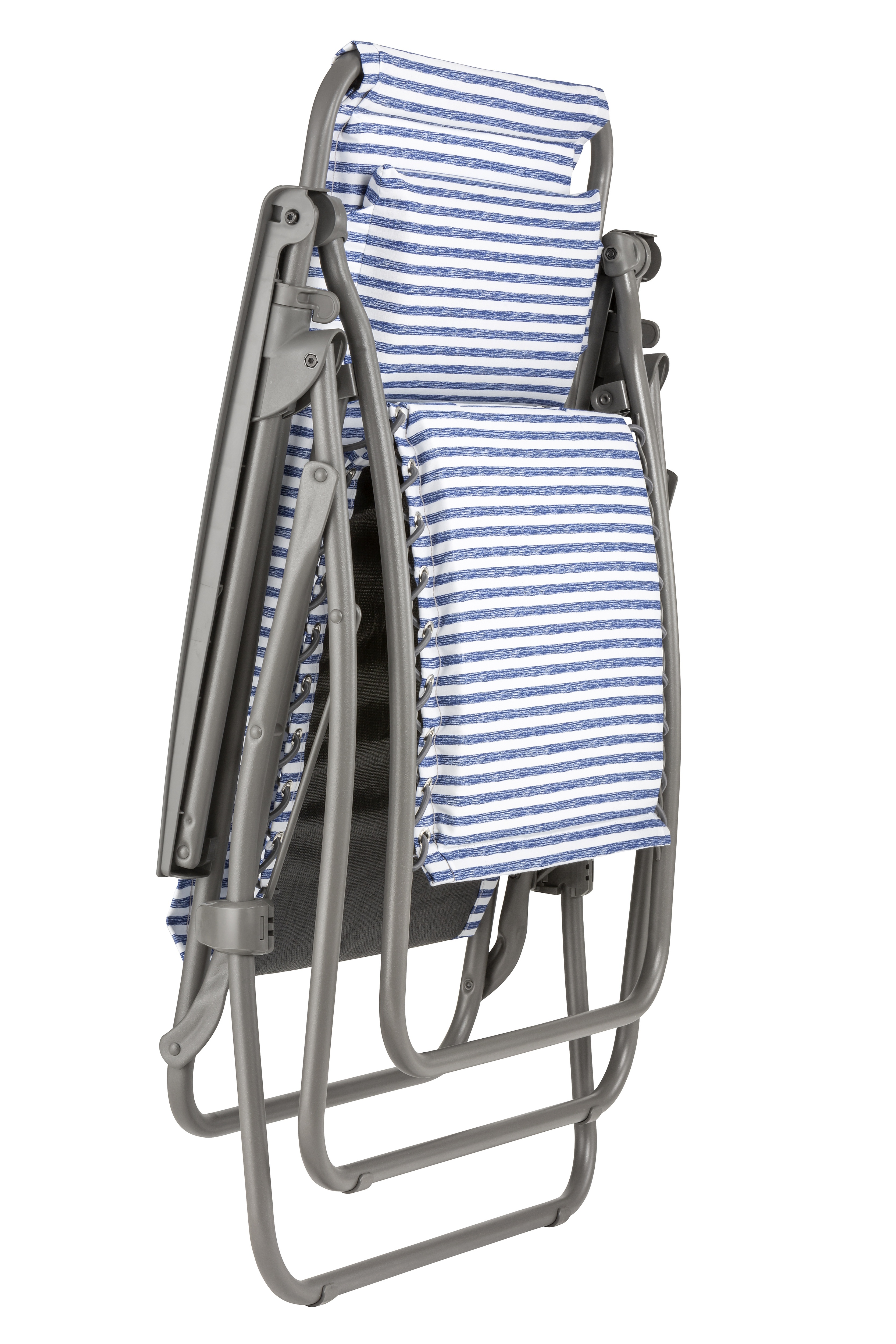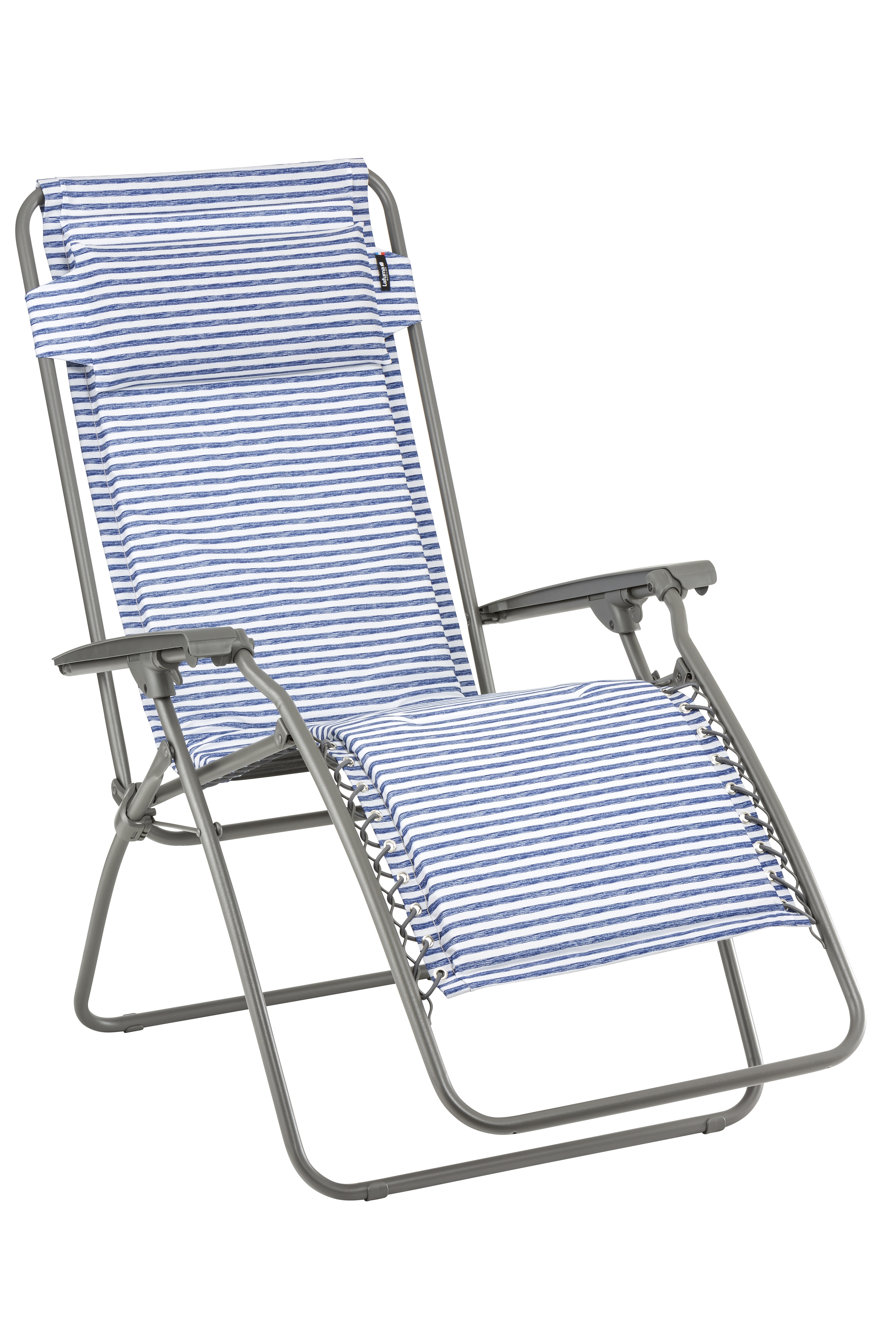 fauteuil de relaxation multiposition pliable, accoudoirs monobloc résine, réglage par stabilisateurs, toile polycoton matelassé garni mousse HD 2 cm, fixation par lacets élastiques remplaçables, tétière coussin réglable et amovible, patins de pieds