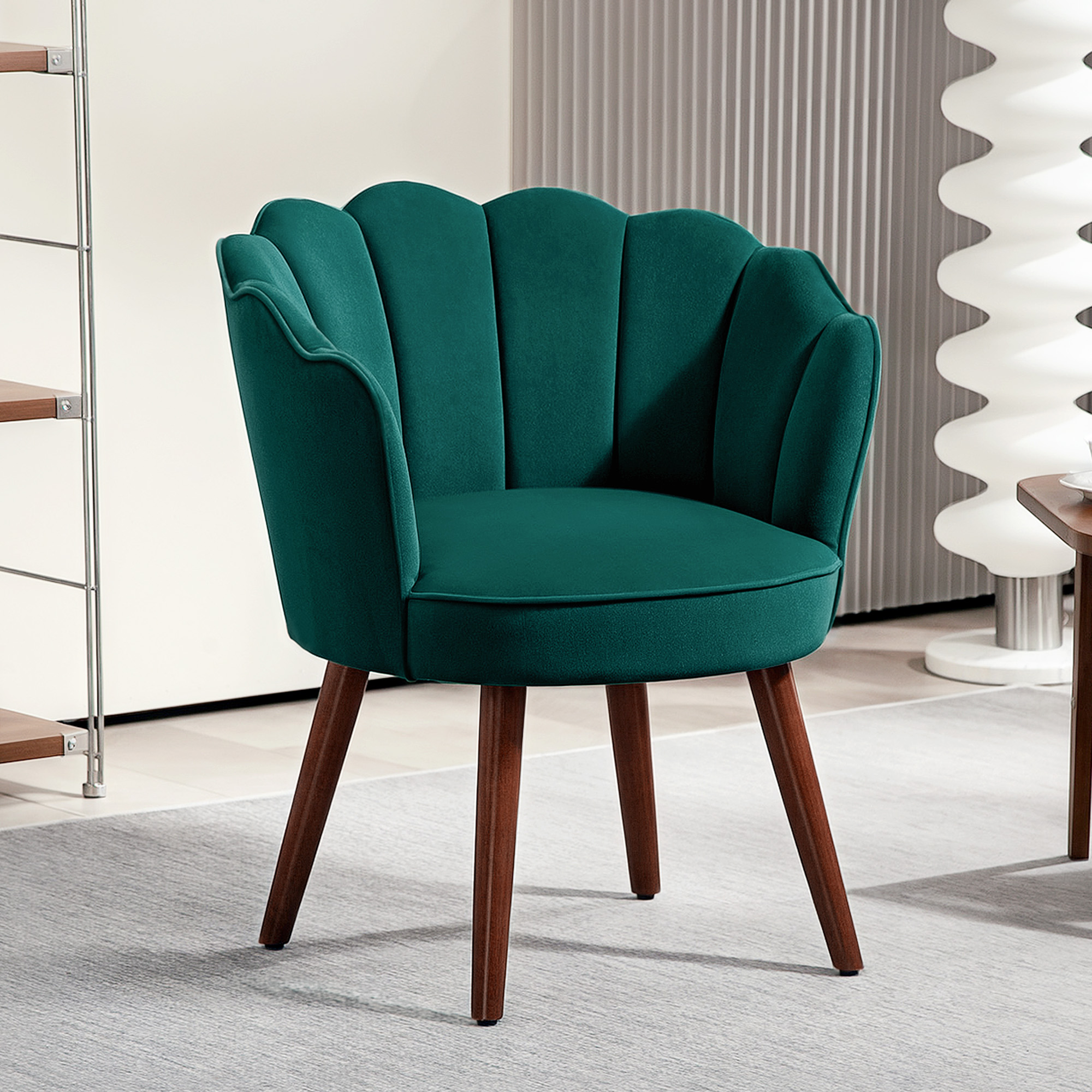 | Libellé | Fauteuil design coquillage piètement effilé bois d'hévéa dossier enveloppant strié aspect velours vert sapin |