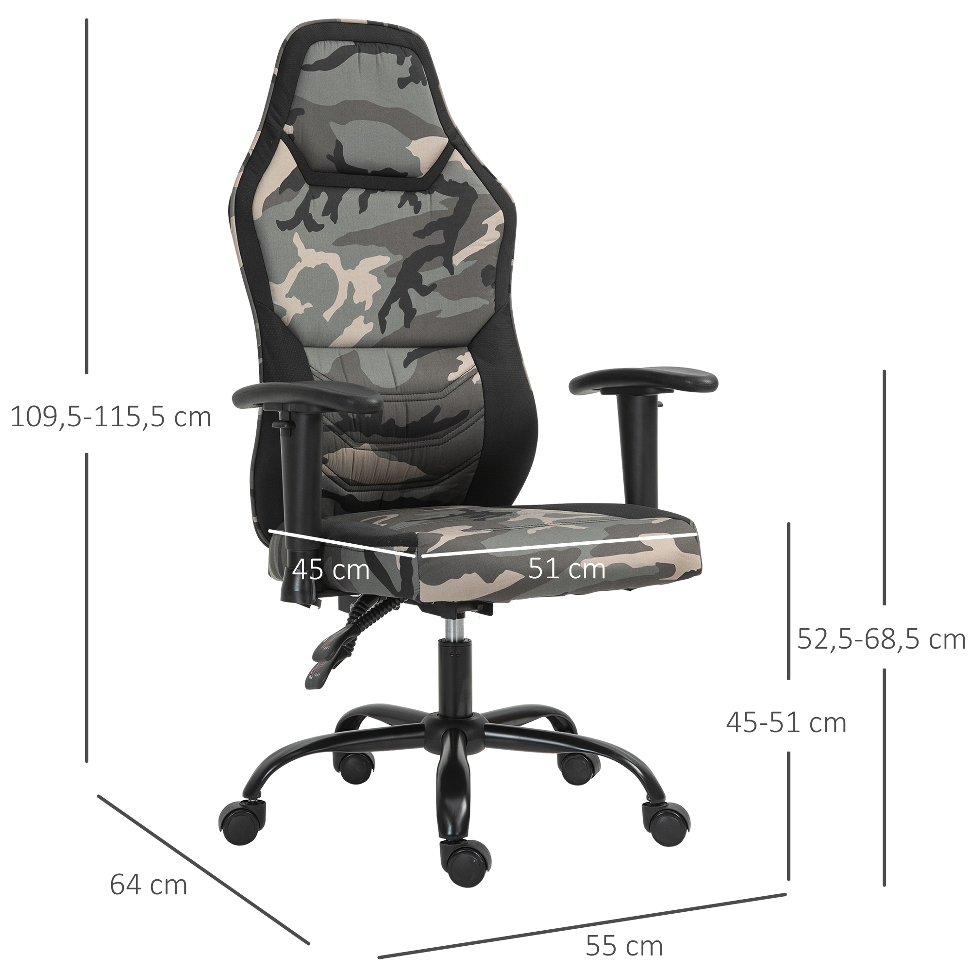 Ce fauteuil de bureau gaming modèle militaire est idéal pour travailler ou jouer dans le confort. Installez-vous dans ce fauteuil rembourré avec une mousse haute densité. Trouvez la position la mieux adaptée en ajustant la hauteur de l'assise (réglable de 45 à 51 cm) et de vos accoudoirs (réglable de 52,5 à 68,5 cm). Sans oublier sa fonction inclinable et sa capacité à pivoter à 360°.
